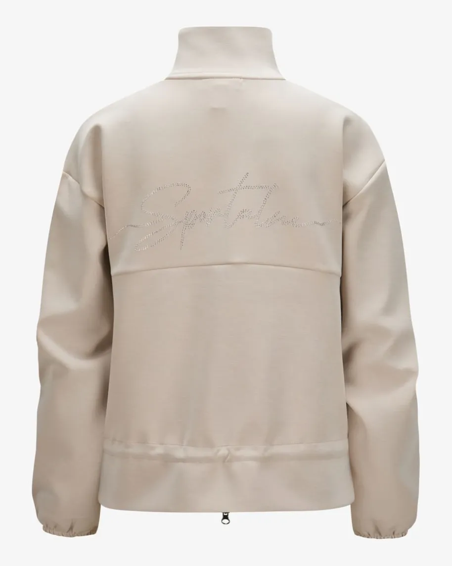 Sweatjacke von Sportalm Emotion in Stein. Mit legerer Schnittführung undvariablem Gummizug auf Hüfthöhe überzeugt dieses Modell aus softer Sweat-Qualität als sportiver Begleiter für kühle Sommernächte, während der rückseitigeLogo-Schriftzug aus Strasssteinen das Gesamtbild modern in Szene setzt.