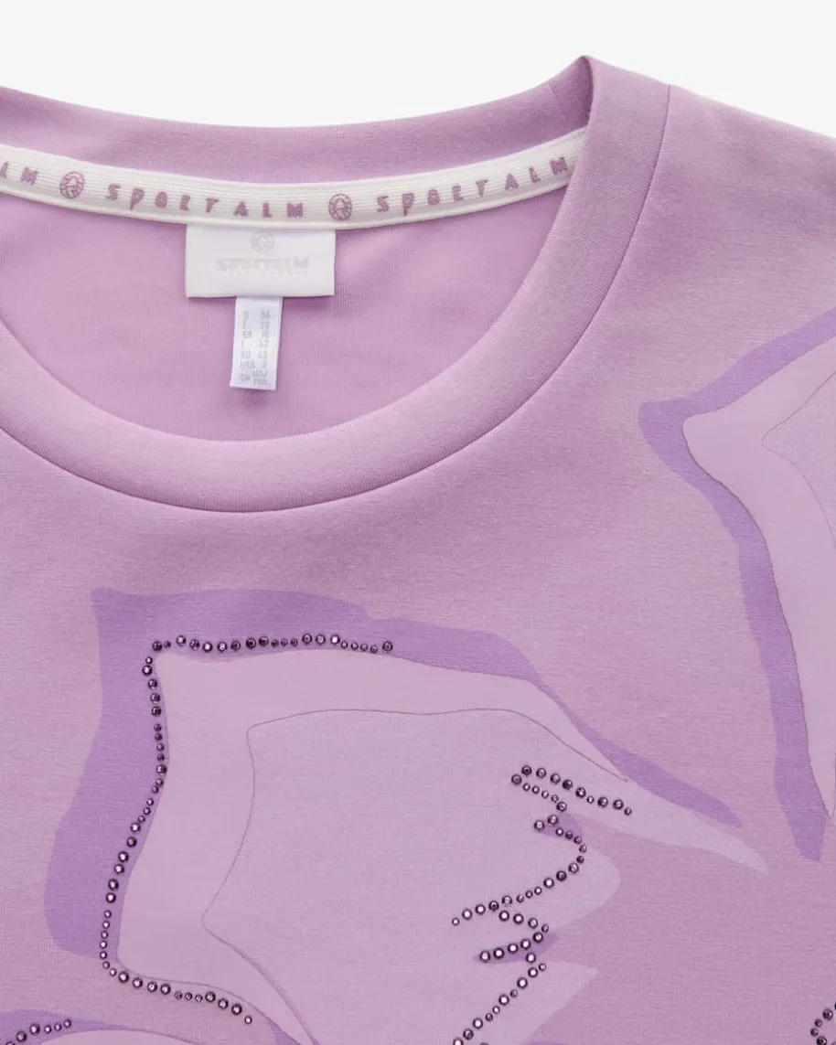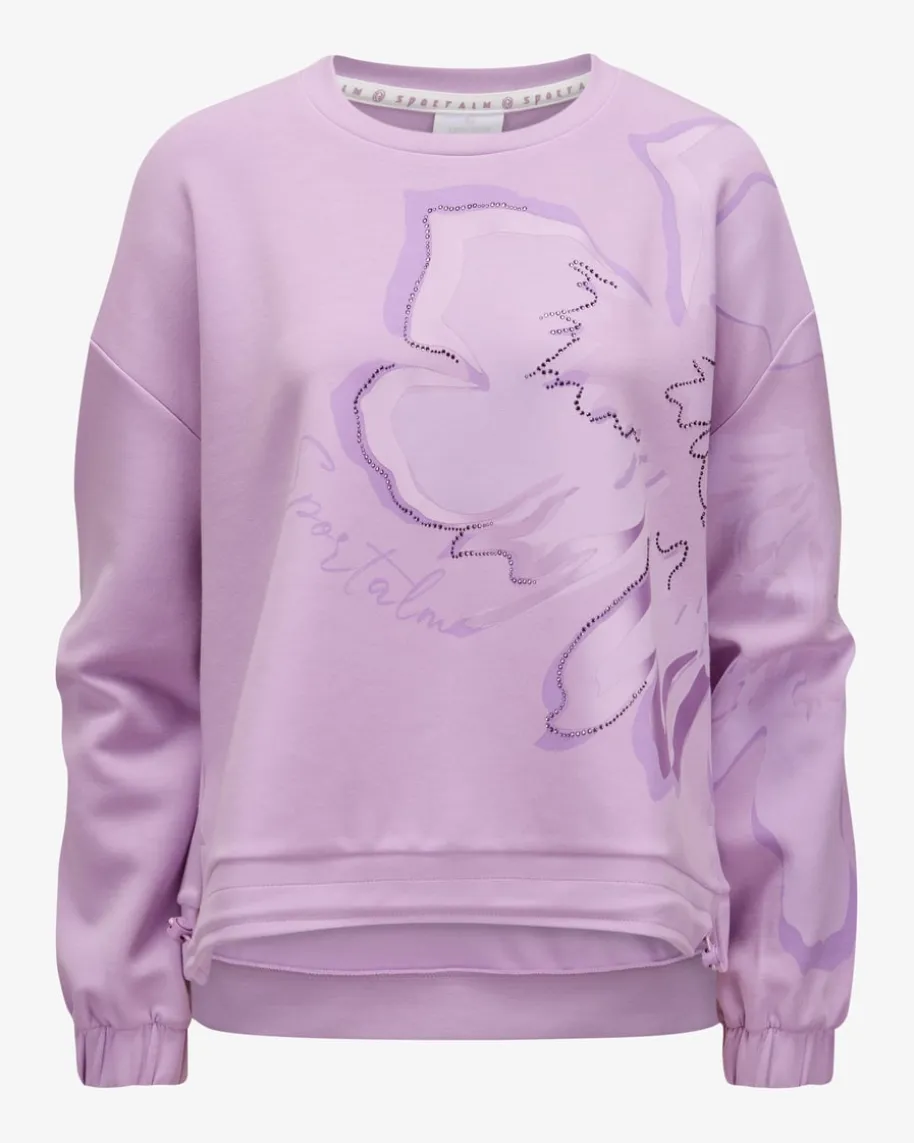 Sweatshirt für Damen von Sportalm Emotion in Lavendel. Für das österreichischeModelabel stehen exklusive Designs sowie höchste Qualitätsstandards im Fokus.Auch dieses legere Modell begeistert mit glatter Material-Verarbeitung, die fürangenehmen Tragekomfort sorgt. Sportive Details in Kombination mit demabstrakten Blumen-Print und changierenden Glitzersteinen runden den Style infemininer Pastell-Nuance gekonnt ab.