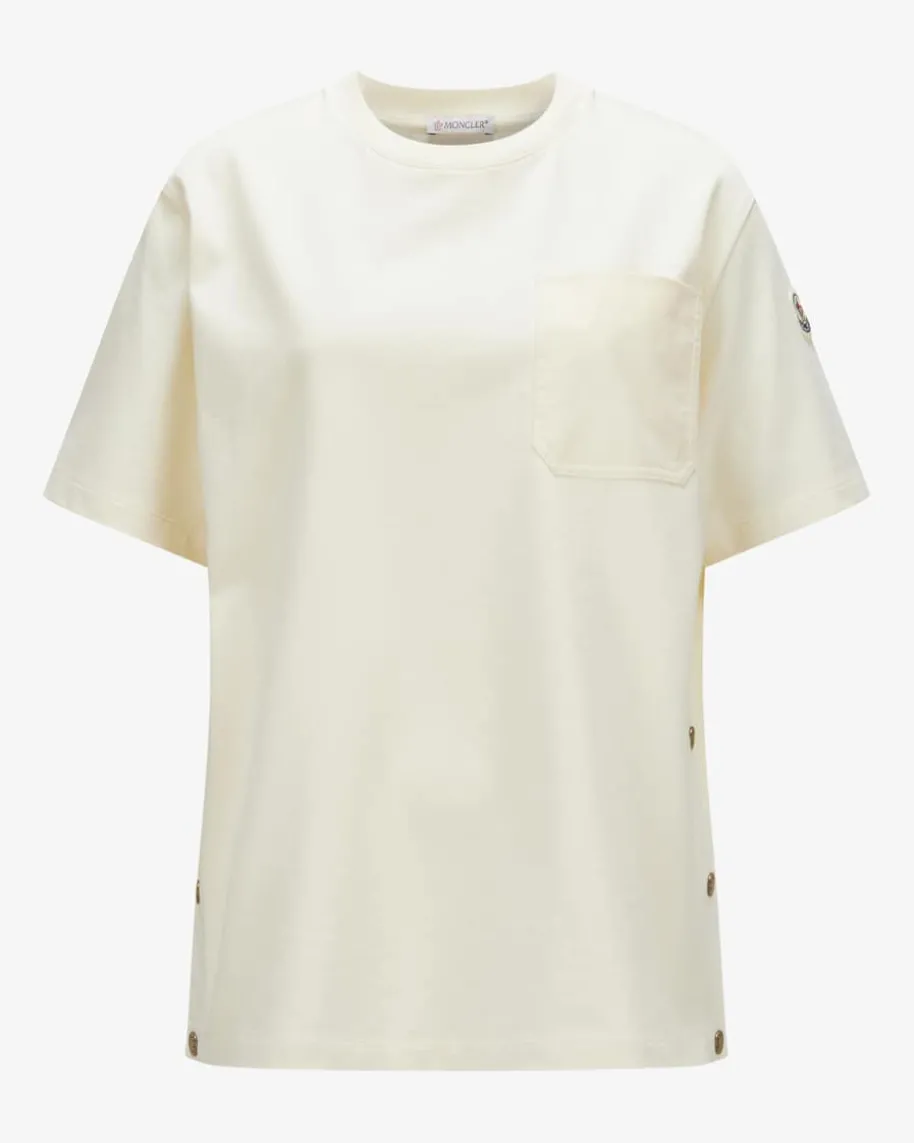 T-Shirt für Damen von Moncler in Creme. Das weit geschnittene Modell präsentiertsich dank der raffinierten Material-Kombination aus unterschiedlicher Baumwoll-Verarbeitung sowie der markanten Seitenschlitze mit Druckknöpfen mit besonderemCharakter, wobei sich die Rückseite im stilvollen Blusen-Look inszeniert.