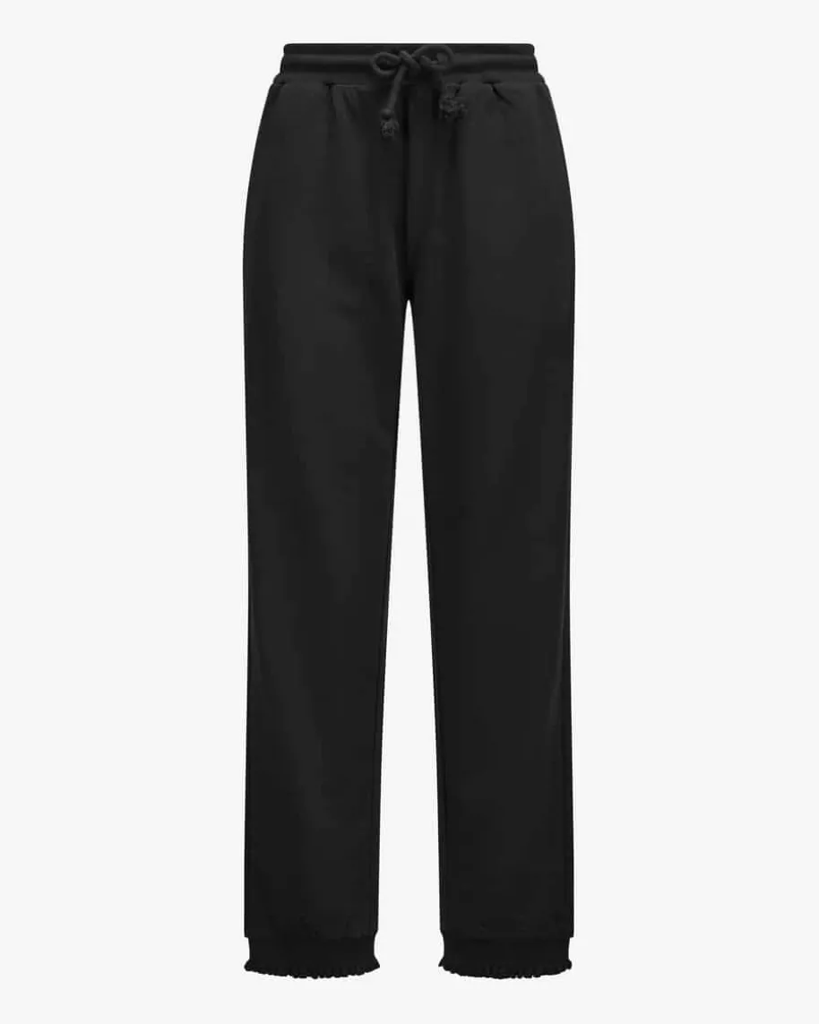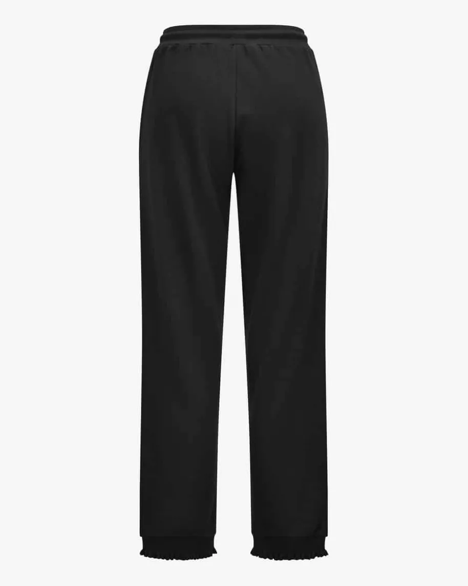 Tabdi Sweathose für Damen von Love Joy Victory in Schwarz. Das Modell ausangenehmer Bio-Baumwolle präsentiert sich in legerer Sweat-Aufmachung, währendmodische Rüschn-Details dem sonst sportivem Lounge-Look ein modernes Updateverleiht.