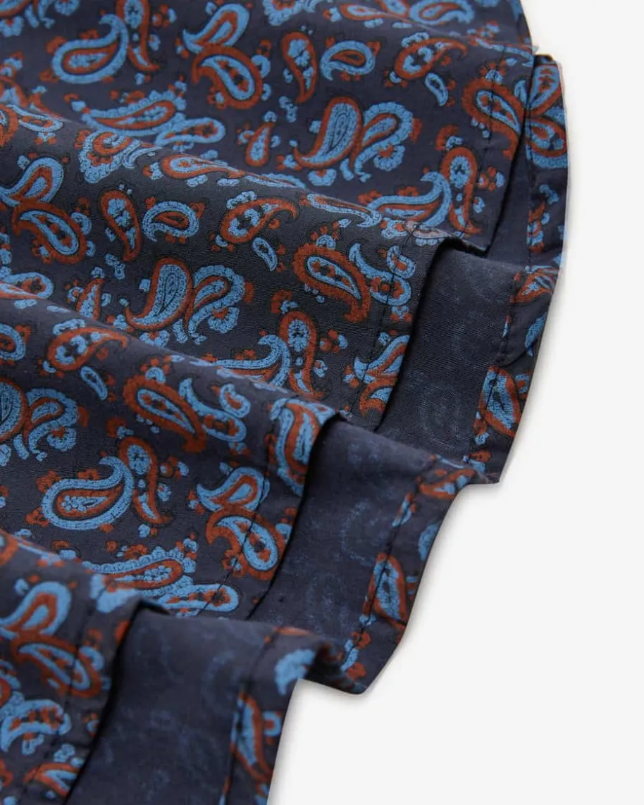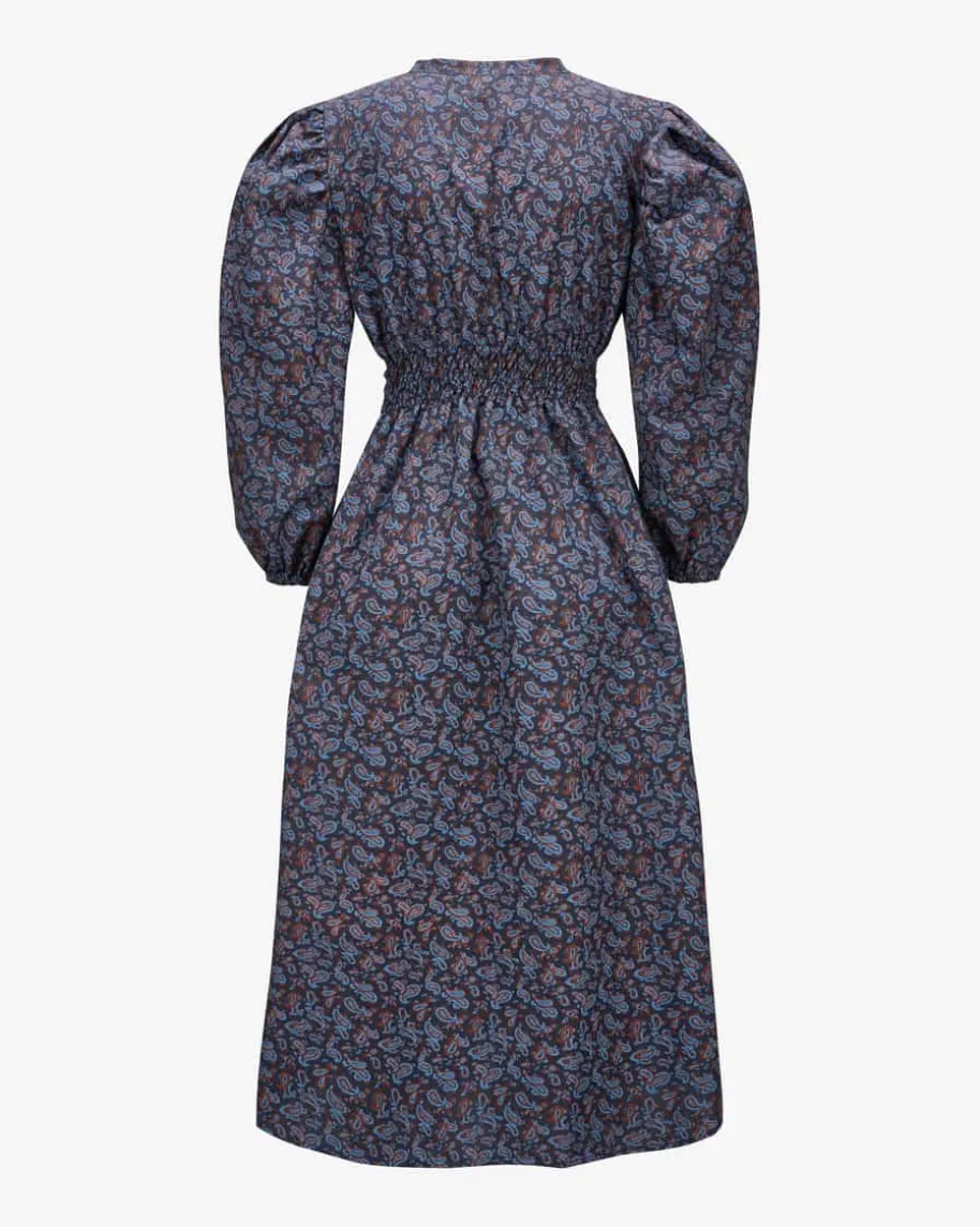 Taroudant Kleid für Damen von Jasmin Khezri in Dunkelblau, Terrakotta und Blau.Jasmin Khezri ist eine deutsche Künstlerin und Illustratorin, die unter demPseudonym „IRMA“ Mode, Kunst und Lifestyle vereint. Auch dieses Modell überzeugtmit stilvollem Paisley-Muster und avanciert dank raffiniert gesmokter Taille zummodischen Blickfang im Boho-Look.