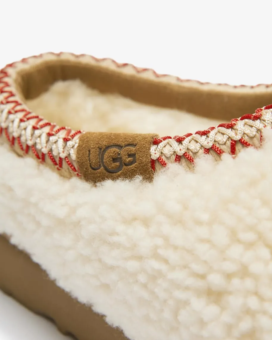 Tasman Maxi Curly Pantoletten für Damen von Ugg in Creme und Camel. Das Modelldes Kult-Labels überzeugt dank dem weichen Lammfell mit einem hohen Wohlfühl-Faktor. Während das tasmanische Flecht-Detail den Schuh modisch abrundet.