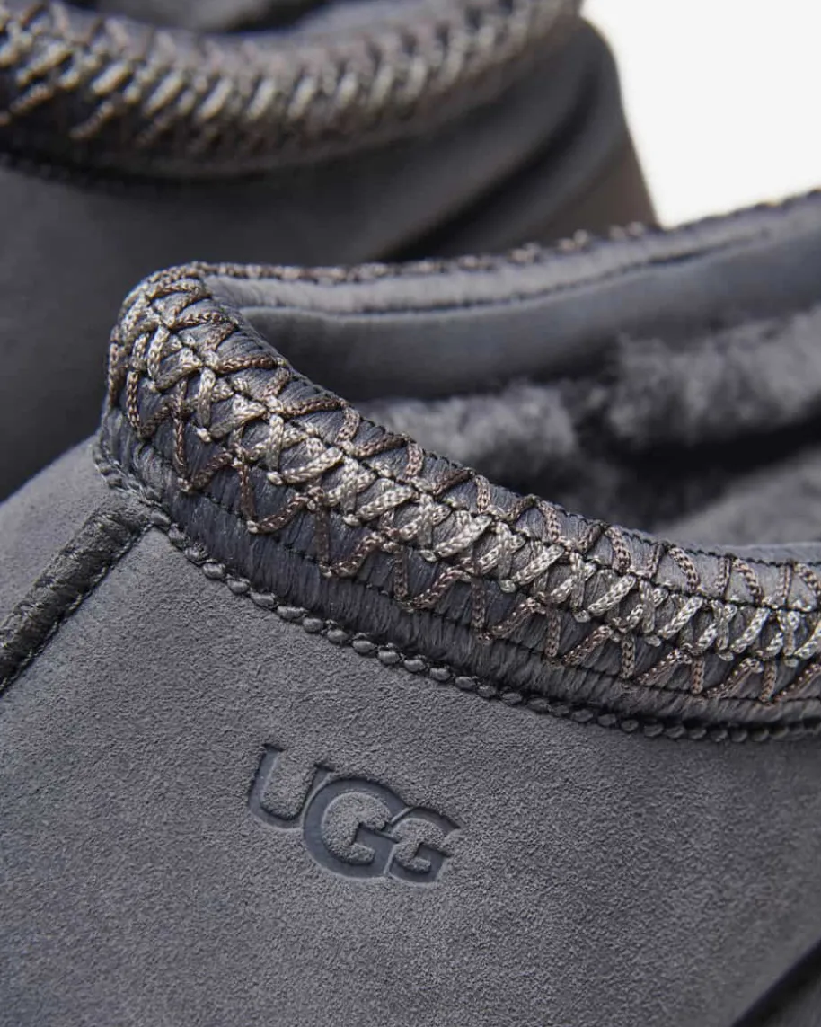 Tazz II Pantoletten für Damen von Ugg in Anthrazit. Das Modell des Kult-Labelsüberzeugt dank des weichen Lammfell-Futters mit hohem Wohlfühl-Faktor, währenddas hochwertige Veloursleder ein zeitloses Design kreiert. Zusätzlich rundet dastasmanische Flecht-Detail den Schuh modisch ab.