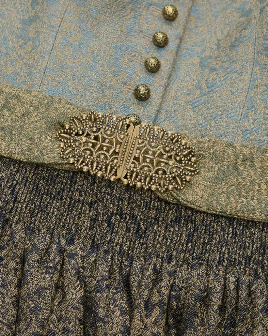 Tessa Leinendirndl lang mit Schürze von Gottseidank in Graublau, Anthrazit undOcker. Das Modell besticht dank des floralen Allover-Dessins als traditionellerFavorit in femininer Aufmachung, während klassische Details einen stilvollenFavoriten für festliche Anlässe kreieren. Die hochwertige Leinen-Qualitätpunktet zugleich mit einer angenehmen Haptik.