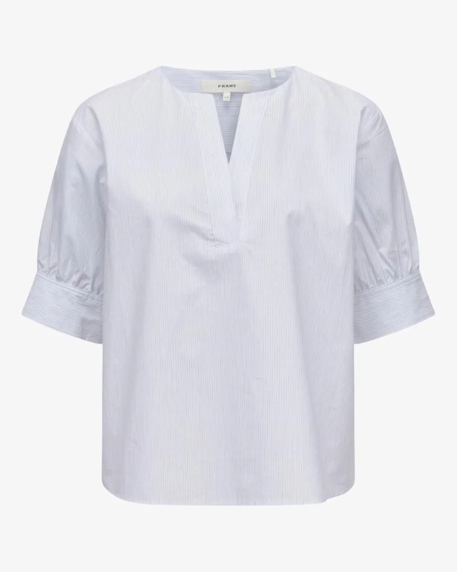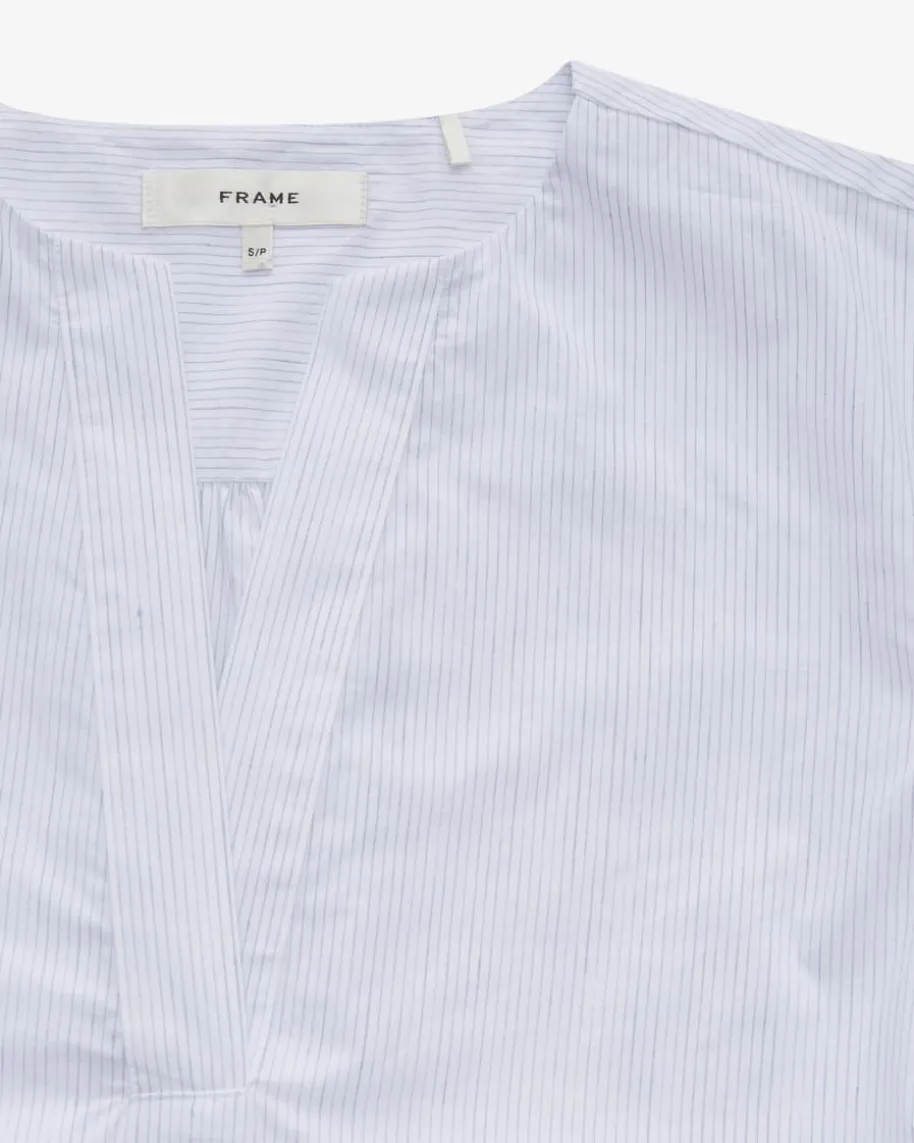 The V Neck Bluse für Damen von Frame in Weiß und Blaugrau. Das Modellpräsentiert sich in hochwertiger Baumwoll-Leinen-Qualität welche für angenehmeTragemomente sorgt, während das feine Streifenmuster in Kombination mitklassischen Details einen sommerlichen Begleiter kreiert der sich vielseitigstylen lässt.