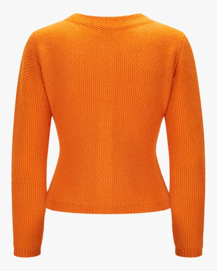 Trachten-Cashmere-Strickjacke für Damen von LODENFREY München 1842 in Orange.Tradition und Moderne in perfektem Zusammenspiel – Das Modellbegeistert durch die klassische Linksstrick-Qualität, während Schmuckstein-Knöpfe den Trachten-Look charmant abrunden.