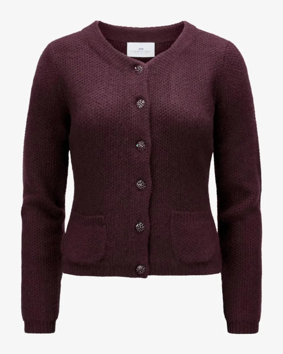 Trachten-Cashmere-Strickjacke für Damen von LODENFREY München 1842 in Bordeaux.Tradition und Moderne in perfektem Zusammenspiel – Das Modellbegeistert durch die klassische Linksstrick-Qualität, während Schmuckstein-Knöpfe den Trachten-Look charmant abrunden.