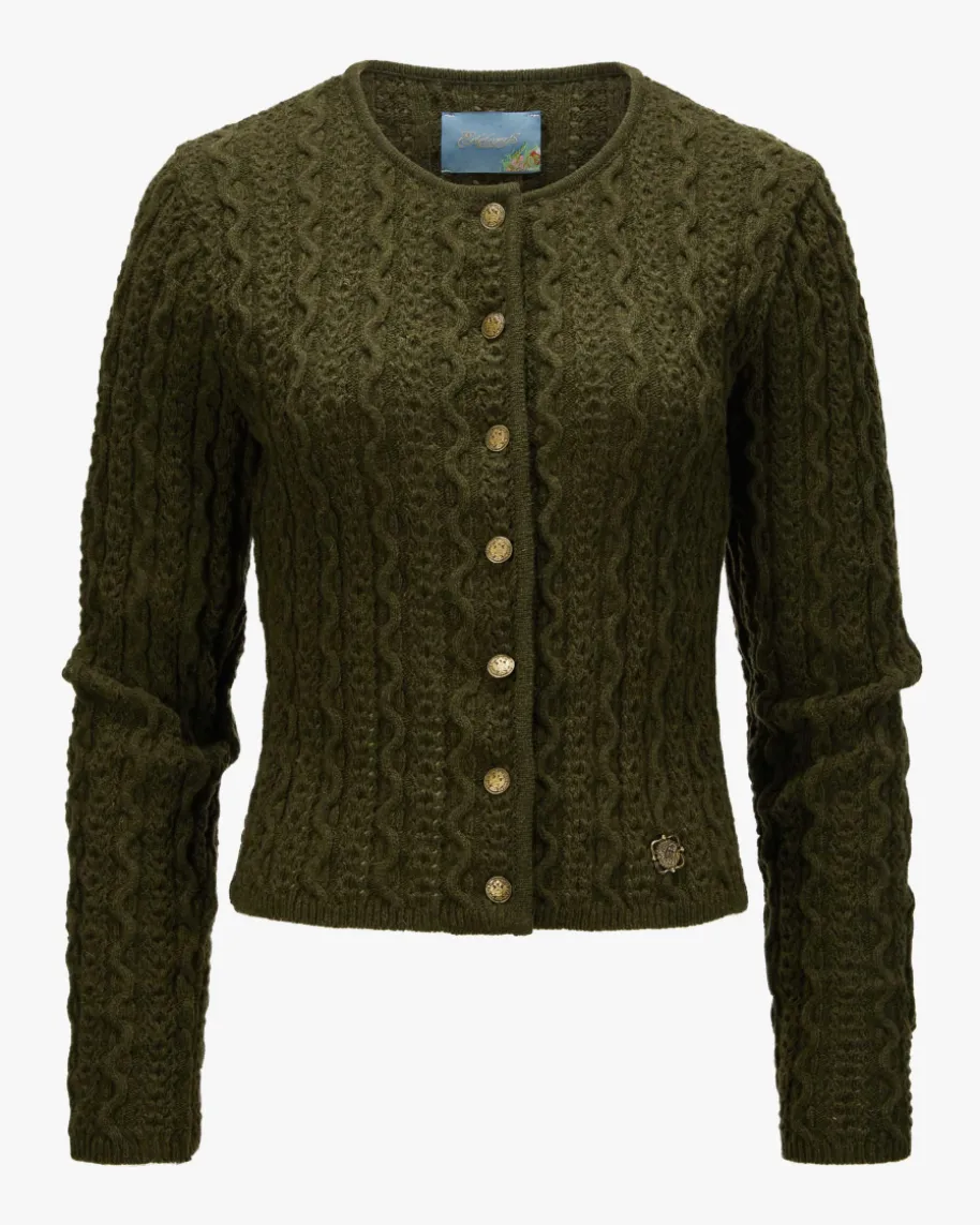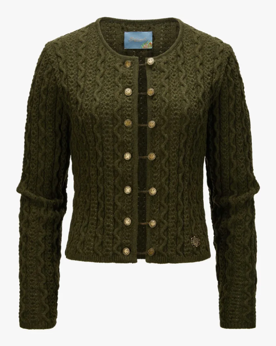 Trachten-Strickjacke für Damen von Edelweiß in Dunkeloliv. Das klassischeStrick-Muster sowie Münz-Knöpfe mit Ketten-Details untermalen dietraditionelle Aufmachung des Modells, während die hochwertige Schurwoll-Qualitätdas Gesamtbild gekonnt vollendet.
