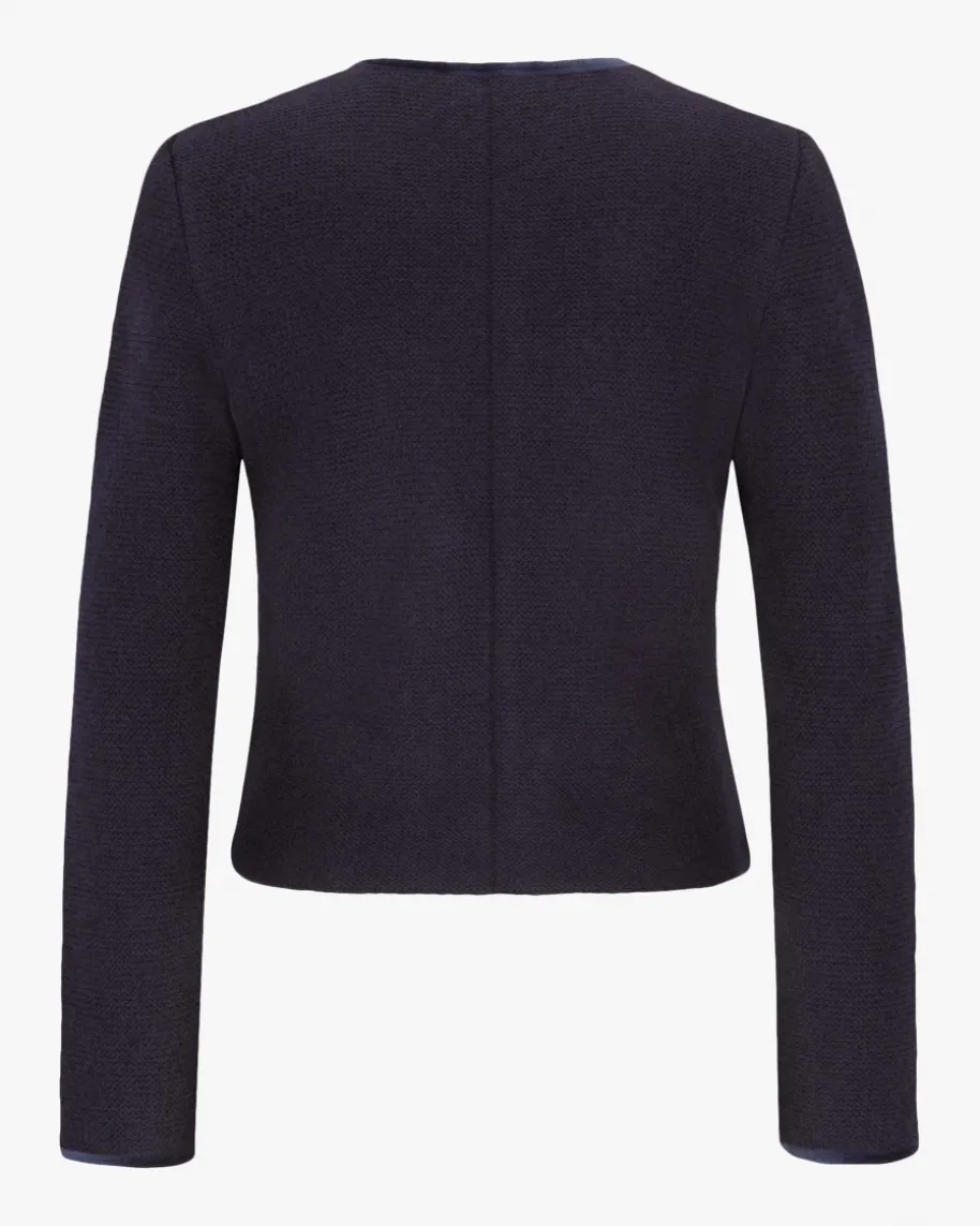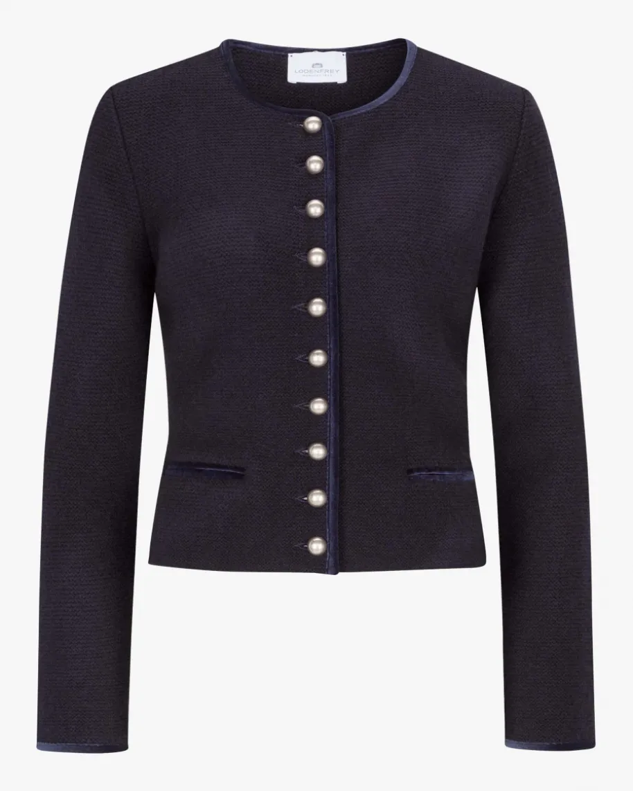 Trachten-Strickjacke für Damen von LODENFREY in Marine. Traditionelles Designundweiche Schurwoll-Qualität zeichnen das gerade geschnittene Modell aus.Ärmelenden, Pattentaschen, Rundhals-Ausschnitt und der Verschluss mitdekorativen Knöpfen sind mit stilvollen Samt-Paspeln versehen.