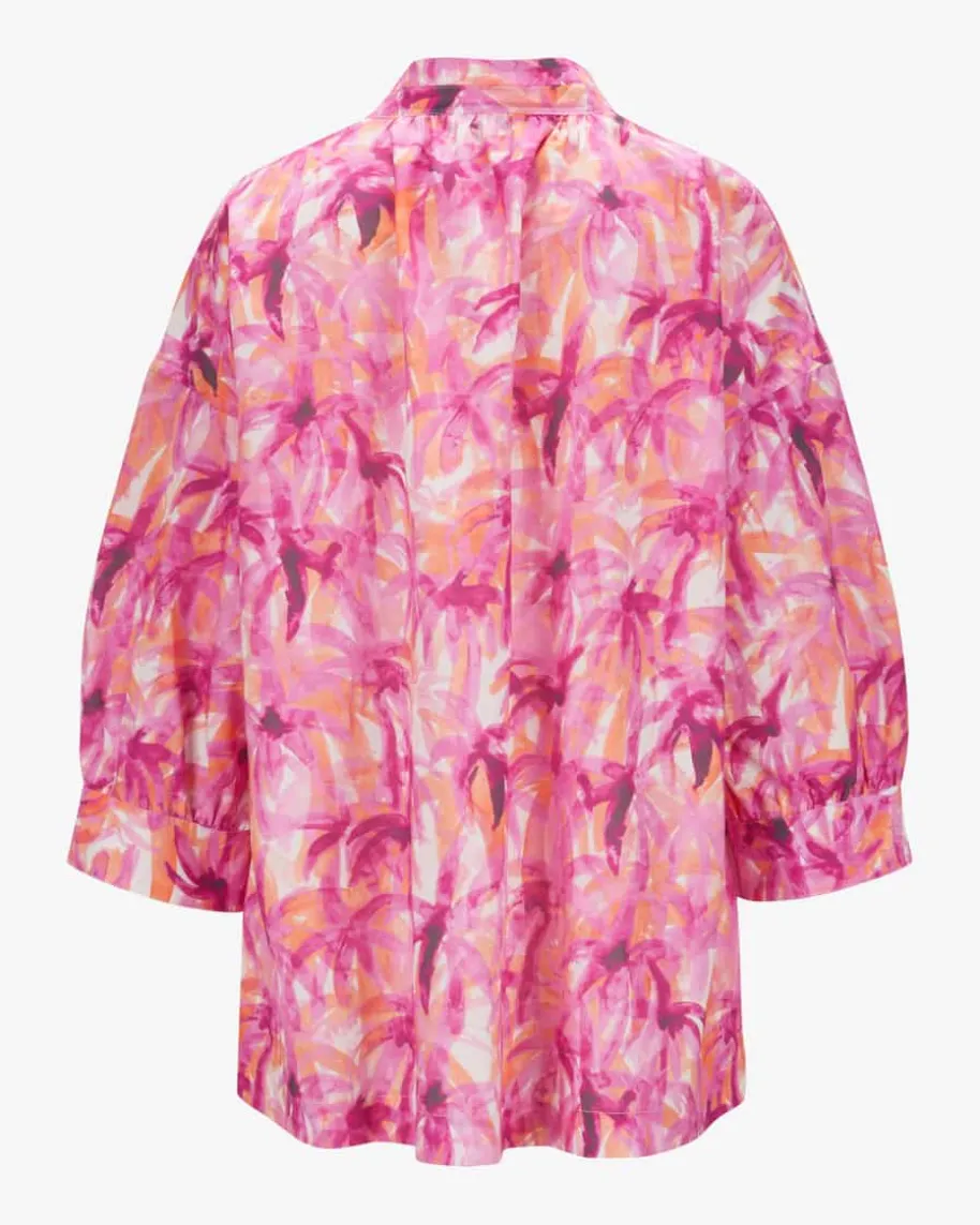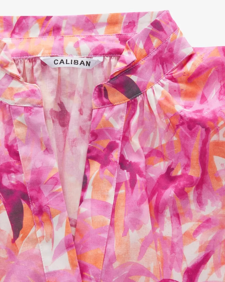 Tunikabluse für Damen von Caliban in Pink, Orange und Weiß. Das Modell punktetmit leichter Baumwoll-Qualität und lockerem Tunika-Schnitt, wodurch einsommerlicher Begleiter mit Stil geschaffen wird. Das aquarellige Allover-Dessinmit Palmen-Motiv rundet den Gesamt-Look gekonnt ab.