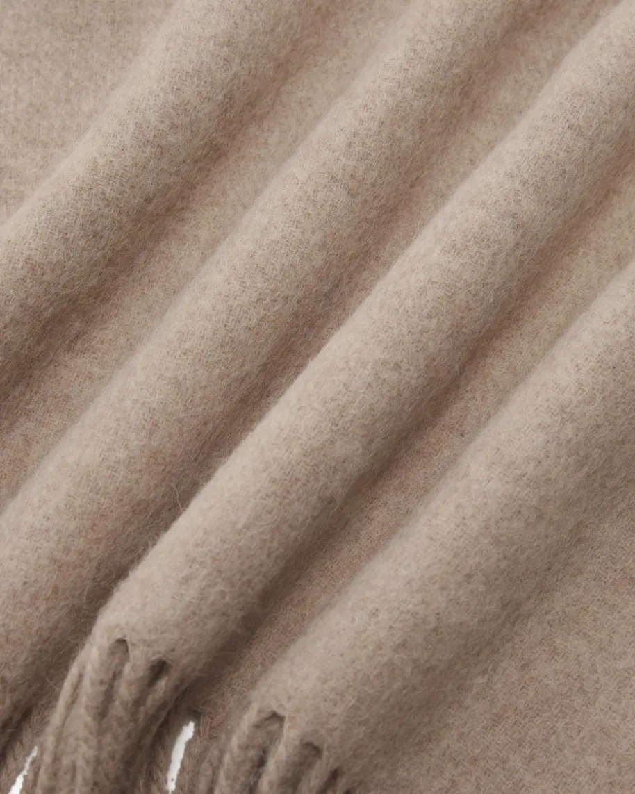 Turtla Poncho-Tuch für Damen von By Malene Birger in Beige. Ein wärmenderKragen-Ersatz mit Poncho-Charakter – Dank der hochwertigen Woll-Verarbeitungbesticht das Modell mit weicher Haptik, während der raffinierte Umlegekragen undFransen-Details einen originellen Country-Style kreieren.