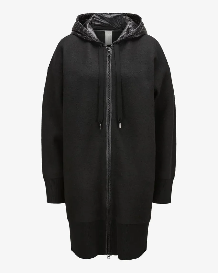 Ulli Ehrlich Strickmantel für Damen von Sportalm in Weiß und Grau. Daslegere Modell zeichnet sich durch die weiche Woll-Verarbeitung mit markantenRippstrick-Bündchen aus, während die changierende Kapuze einen sportivenKontrast schafft.