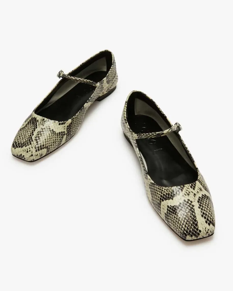 Uma Ballerinas für Damen von Aeyde in Creme und Schwarz. Während die Flats dankder Schlangen-Optik einen extravaganten Touch erhalten, kreiert die eckige Formzusammen mit dem filigranen Riemen einen femininen Begleiter für stilvolleLooks.