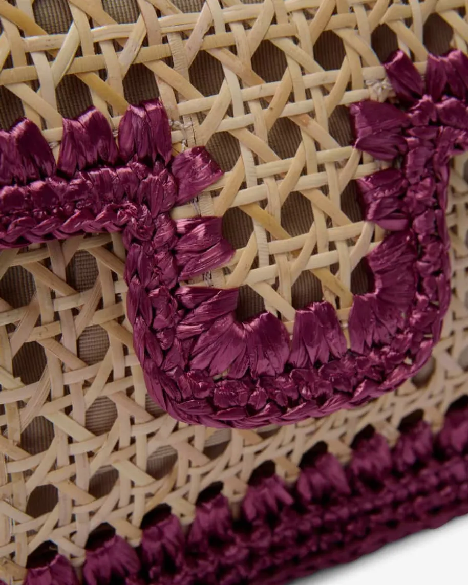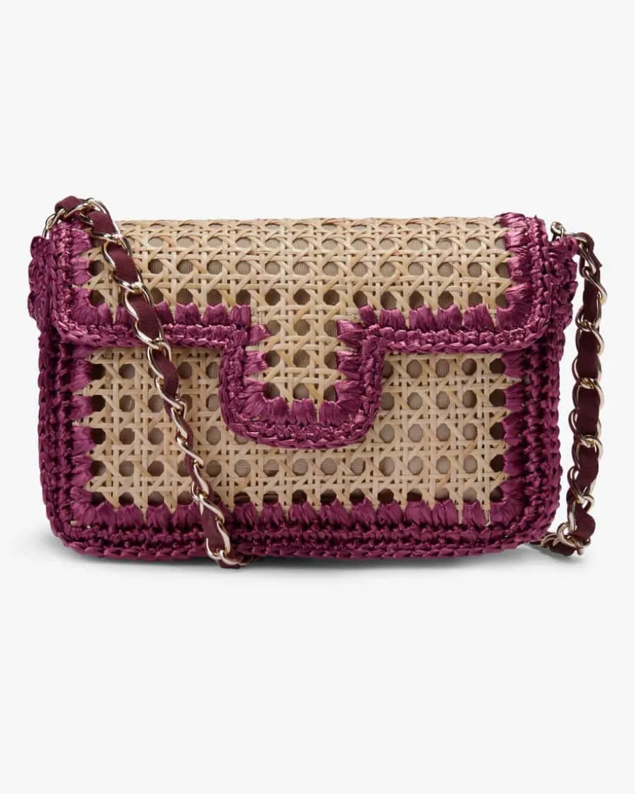 Umhängetasche von Caterina Bertini in Natur und Bordeaux. Made in Italy – Das1925gegründete Label hat bereits damals angefangen sich auf geflochtene Produkte zuspezialisieren und begeistert heutzutage mit hochwertiger Handwerkskunst, dankwelcher jedes Design zu einem Unikat wird. Diese Tasche begeistert incharakteristischer Wiener-Geflecht Aufmachung, während der Kettenträger denletzten Schliff verleiht.