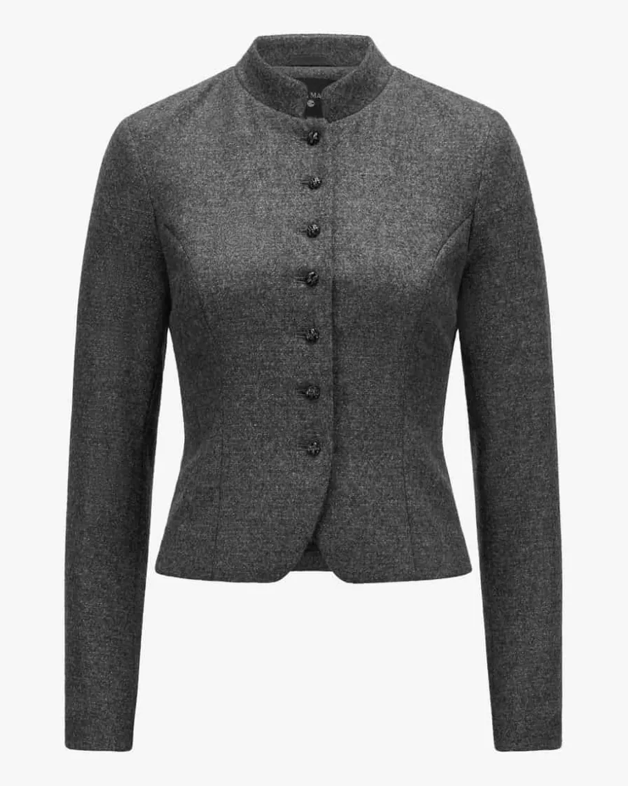 Valentina Trachtenjacke für Damen von Kinga Mathe in Anthrazit. Das Modellüberzeugt dank hochwertigem Wollmix in traditioneller Aufmachung, welche durchklassische Details sowie die taillierte Silhouette eine feminine Passformerhält. Die changierenden Glitzerfasern und raffinierten Knöpfe runden denTrachten-Look gekonnt ab.