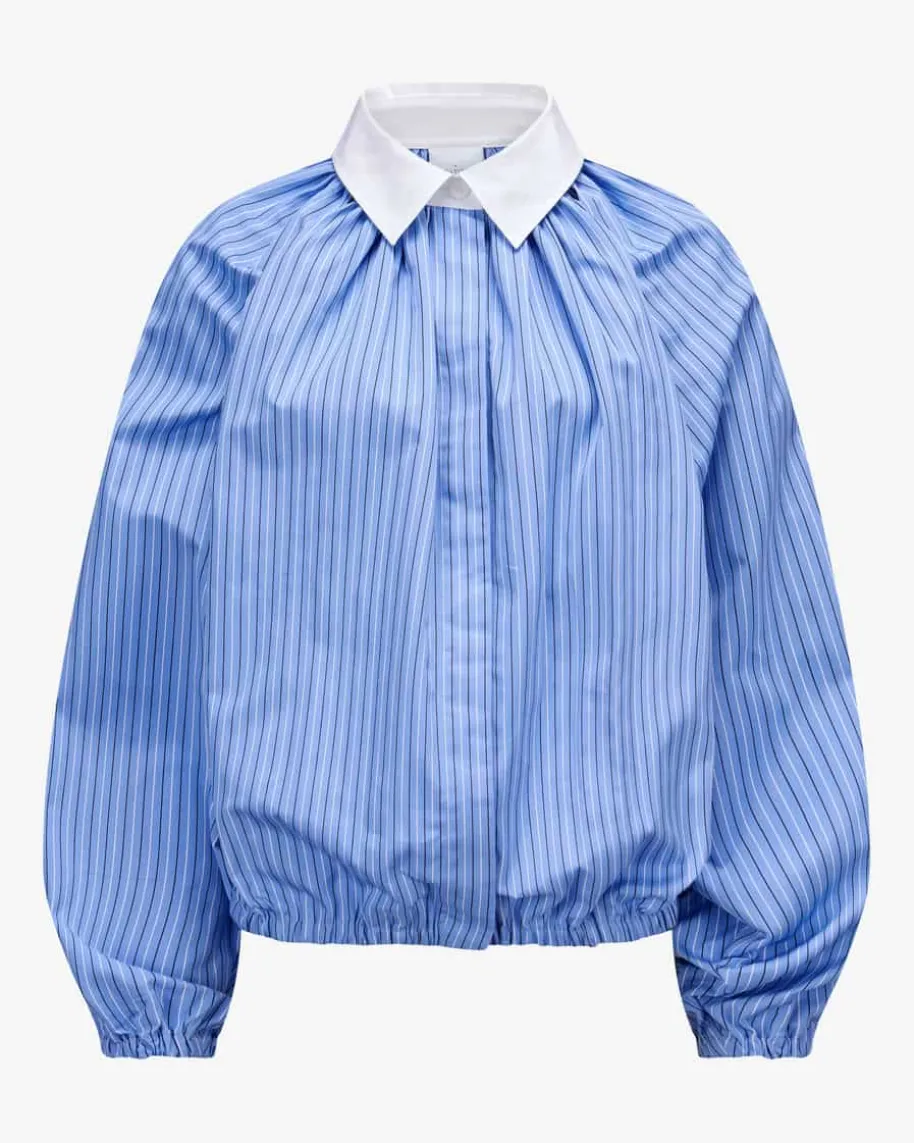 Volume Collar Hemdbluse für Damen von Patou in Hellblau, Weiß und Schwarz. DasModell präsentiert sich mit klassischen Hemd-Details, wird jedoch durch dieoriginelle boxy Schnittführung sowie den elastischen Bündchen zu einem wahrenHingucker. Das markante Streifen-Webmuster in Kombination mit dem farblichabgesetzten Hemdkragen verleiht dem Look einen modischen Twist.