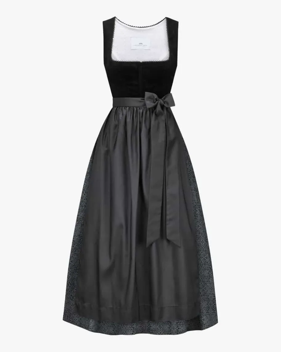 Wiesndirndl lang mit Schürze für Damen von LODENFREY München 1842 in Schwarz undGrau. Dank der Verwendung von hochwertiger Baumwollsamt-Qualität im Mieder undeinem feinen Ornament-Muster im Rock wird ein traditioneller Favorit mitminimalistischem Charme kreiert. Die changierende Schürze mit Seide rundet dasTrachten-Gesamtbild harmonisch ab.