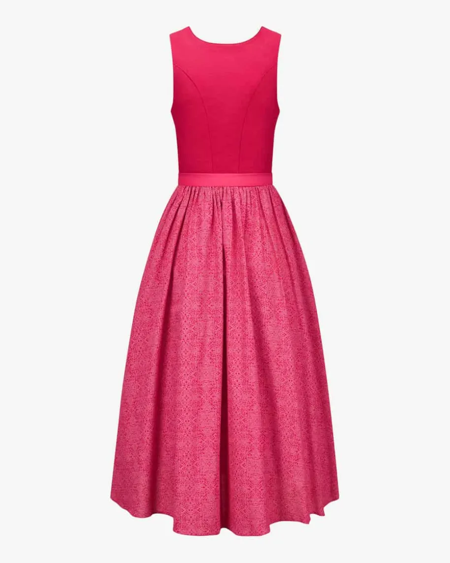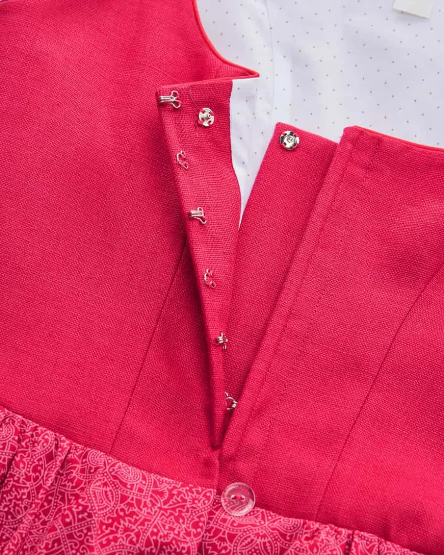 Wiesndirndl lang mit Schürze für Damen von LODENFREY München 1842 in Rot. Dankder Verwendung von hochwertiger Leinen-Qualität im Mieder und einem feinenOrnament-Muster im Baumwoll-Rock wird ein traditioneller Favorit mitminimalistischem Charme kreiert. Die changierende Schürze mit Seide rundet dasTrachten-Gesamtbild harmonisch ab.