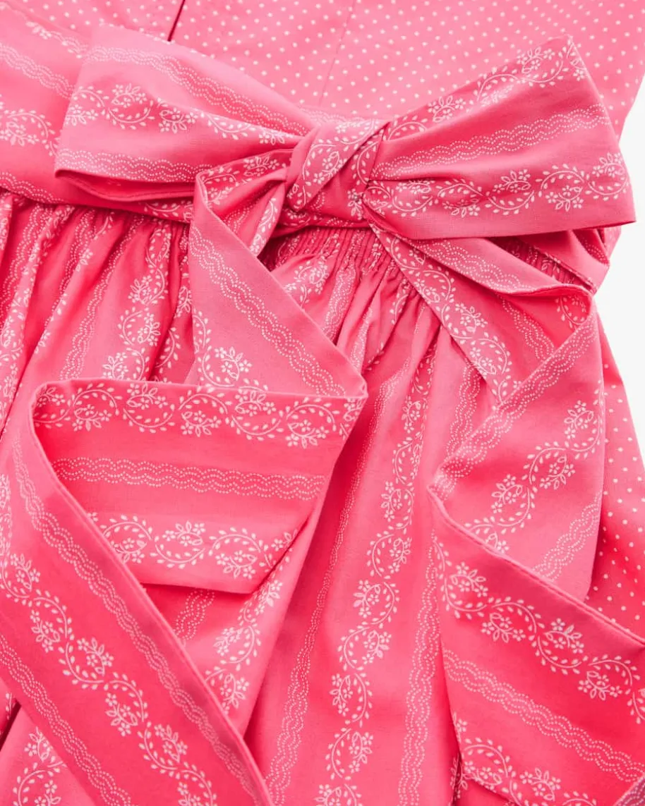 Wiesndirndl lang mit Schürze für Damen von LODENFREY in Pink und Weiß. Dank derVerwendung von leichter Baumwoll-Qualität und der Kombination von feinem Punkte-Muster und floralem Print wird ein traditioneller Favorit mit femininem Charmekreiert. Klassische Trachten-Details runden das stilvolle Gesamtbild harmonischab.