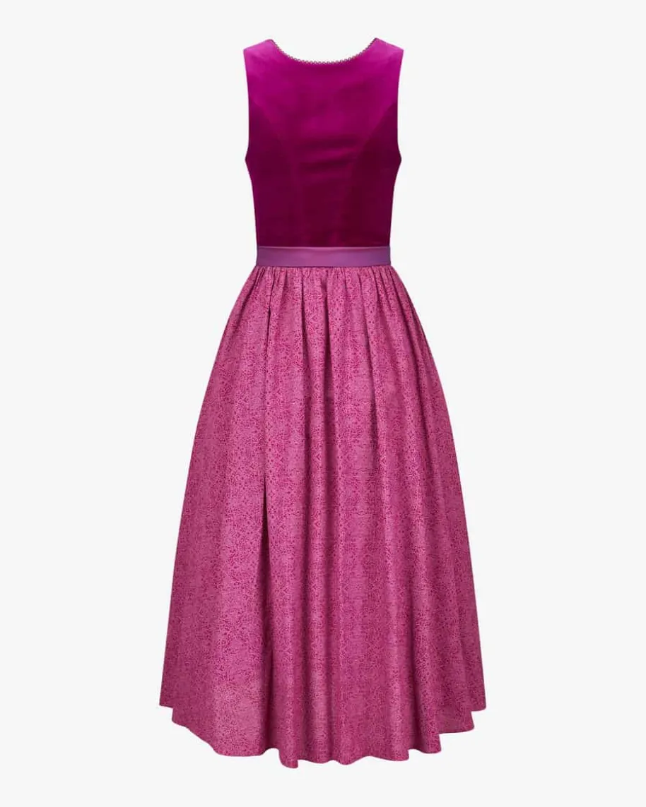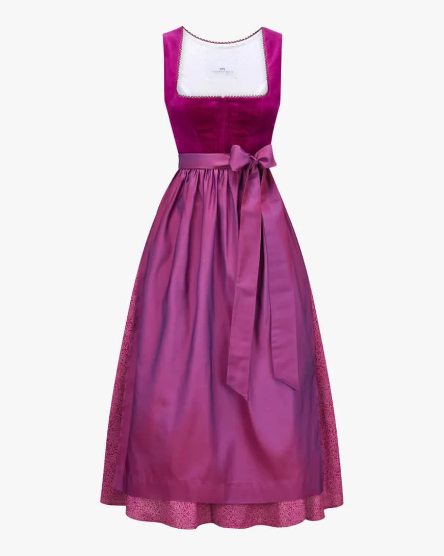 Wiesndirndl lang mit Schürze für Damen von LODENFREY München 1842 in Beere undAltrosa. Dank der Verwendung von hochwertiger Baumwollsamt-Qualität im Miederund einem feinen Ornament-Muster im Rock wird ein traditioneller Favorit mitminimalistischem Charme kreiert. Die changierende Schürze mit Seide rundet dasTrachten-Gesamtbild harmonisch ab.