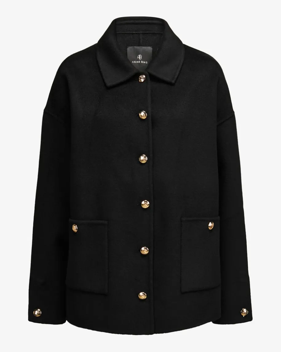 Wolljacke für Damen von Anine Bing in Schwarz. Das ungefütterte Modellpräsentiert sich mit weiter Schnittführung und markanten Seitenschlitzen,während der hochwertige Woll-Cashmere-Mix eine besonders weiche Haptik kreiert.Goldfarbene Logoknöpfe runden den stilvollen Look gekonnt ab.