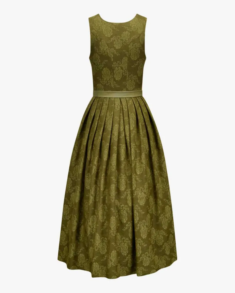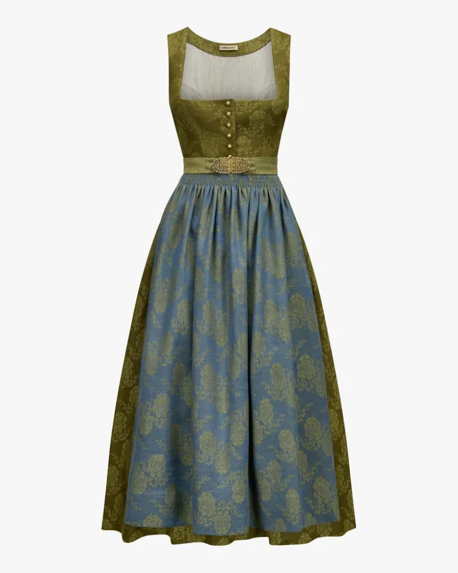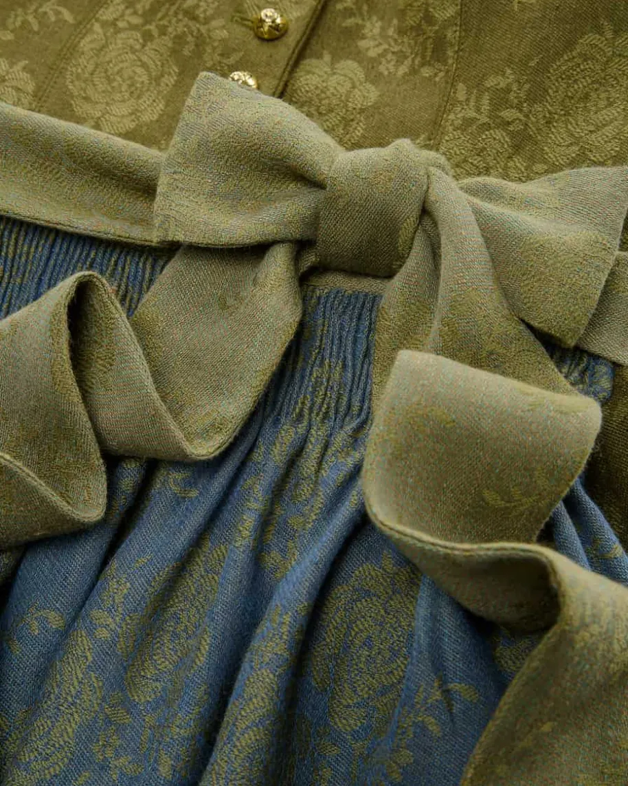 Babette Dirndl lang mit Schürze für Damen von Gottseidank in Moosgrün und Blau.Tracht mit modernem Zeitgeist – Dank des floralen Jacquard-Musters inhochwertiger Leinen-Schurwoll-Qualität begeistert das Modell in traditionellerAufmachung. Zugleich rundet die gestiftelte Schürze mit labeltypischen,austauschbaren Schürzenbändern den Look gekonnt ab.