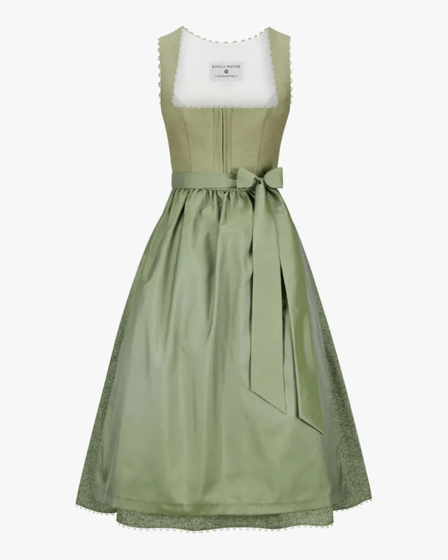 Gaby Dirndl lang mit Schürze für Damen von Kinga Mathe in Salbei. Mit Liebe zumDetail entwirft das deutsche Label aufwendige Trachten- Kreationen mit demgewissen Etwas und überzeugt Trachten-Liebhaber mit erlesener Stoffauswahl sowiekreativen Designs. Das Mieder besticht durch die Verwendung von hochwertigemLeinen und wird durch eine Schlaufenborte stilvoll ergänzt. Zugleich setzt derRock mit Floralem-Muster moderne Akzente, während die edle changierende Schürzeden Trachten-Look harmonisch vollendet.