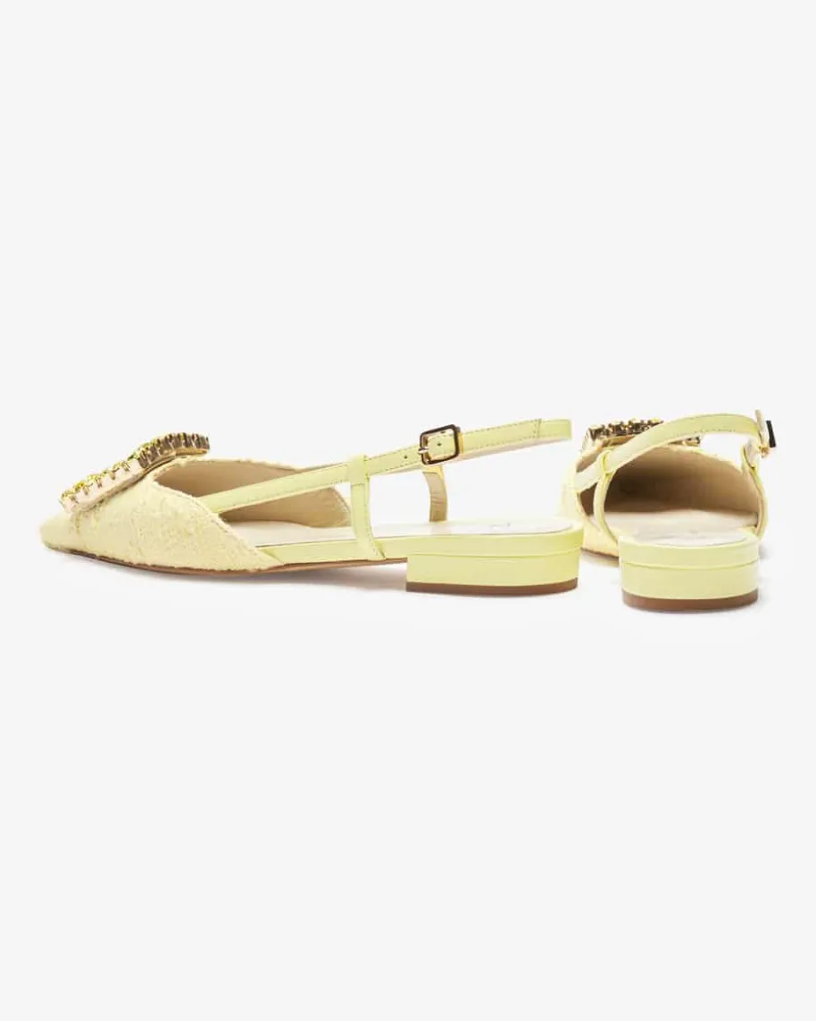 Lavanda Slingback-Ballerinas für Damen von Festa in Gelb. Dieses Modellbegeistert dank der stilvollen Kombination aus Tweed-Aufmachung undverstellbarem Slingback-Riemen, während die markante viereckige Brosche mitSchmuckstein-Besatz den Schuh zu einem absoluten Blickfang für feminine Looksavancieren lässt.
