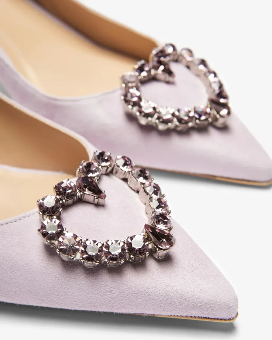 Lester Slingback-Pumps für Damen von Festa in Flieder. Dieses Modell bestichtdank der eleganten Veloursleder-Aufmachung und dem verstellbaren Slingback-Riemen, während die markante herzförmige Brosche mit Schmuckstein-Besatz denSchuh zu einem absoluten Blickfang für Ihre Trachten-Looks macht.