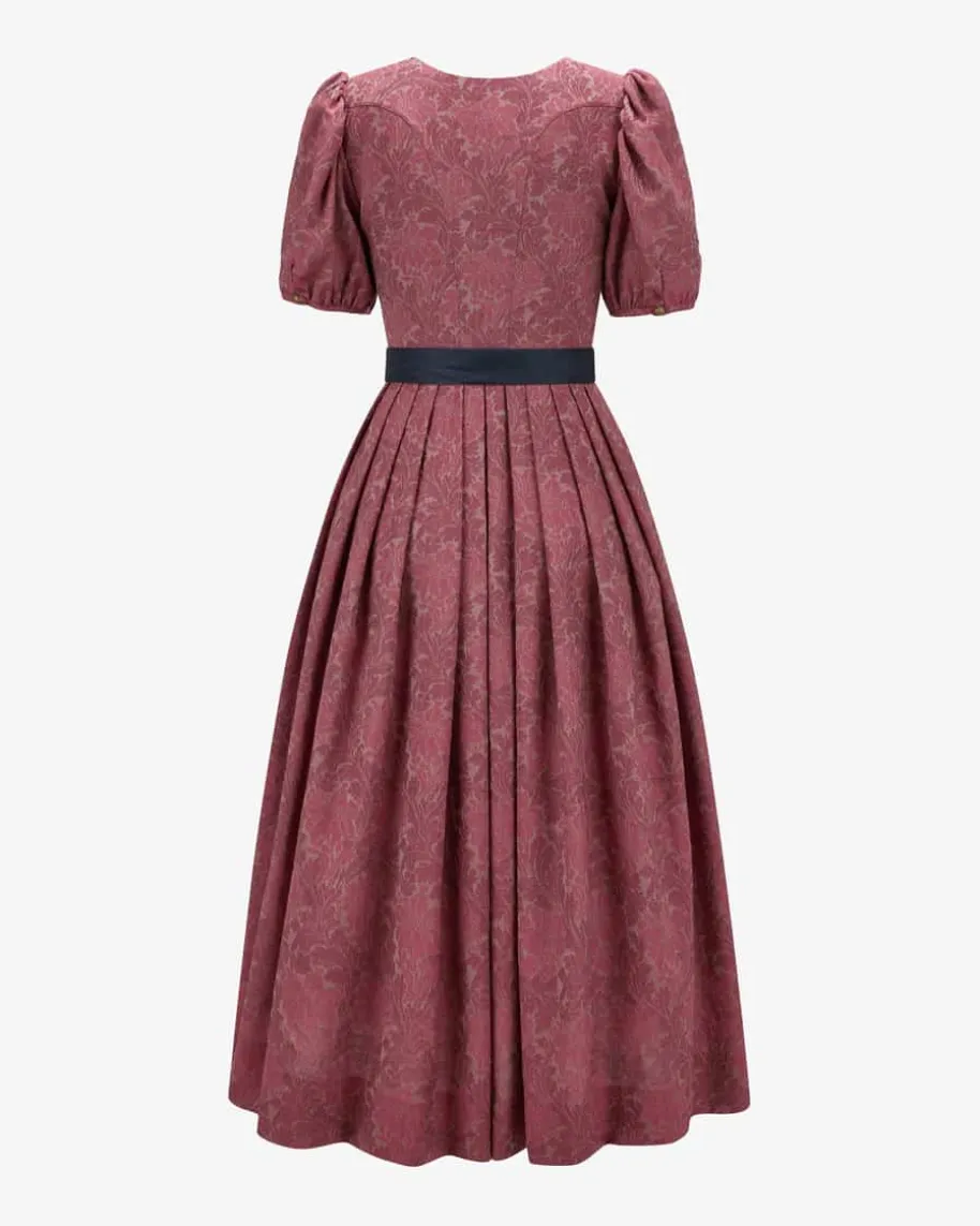 Lina Dirndl lang mit Leinenschürze für Damen von Gottseidank in Himbeere undTaupe. Tracht mit modernem Zeitgeist – Dank des floralen Allover-Mustersbegeistert das Modell in traditioneller Aufmachung mit modernem Charme, währendraffinierte Knöpfe den letzten Schliff verleihen. Zugleich rundet die schlichteSchürze das Trachten-Design mit angesagten Puff-Ärmeln gekonnt ab.