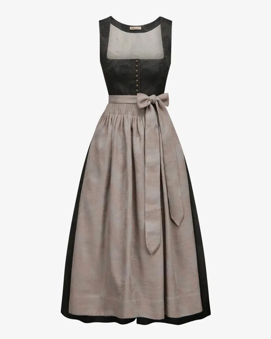 Monika Dirndl lang mit Schürze für Damen von Gottseidank in Schwarz, Taupe undHellgrau. Tracht mit modernem Zeitgeist – Dank des floralen Jacquard-Musters inhochwertiger Leinen-Schurwoll-Qualität begeistert das Modell mit traditionellerAufmachung. Zugleich rundet die gestiftelte Schürze mit labeltypischen,austauschbaren Schürzenbändern den Look gekonnt ab.