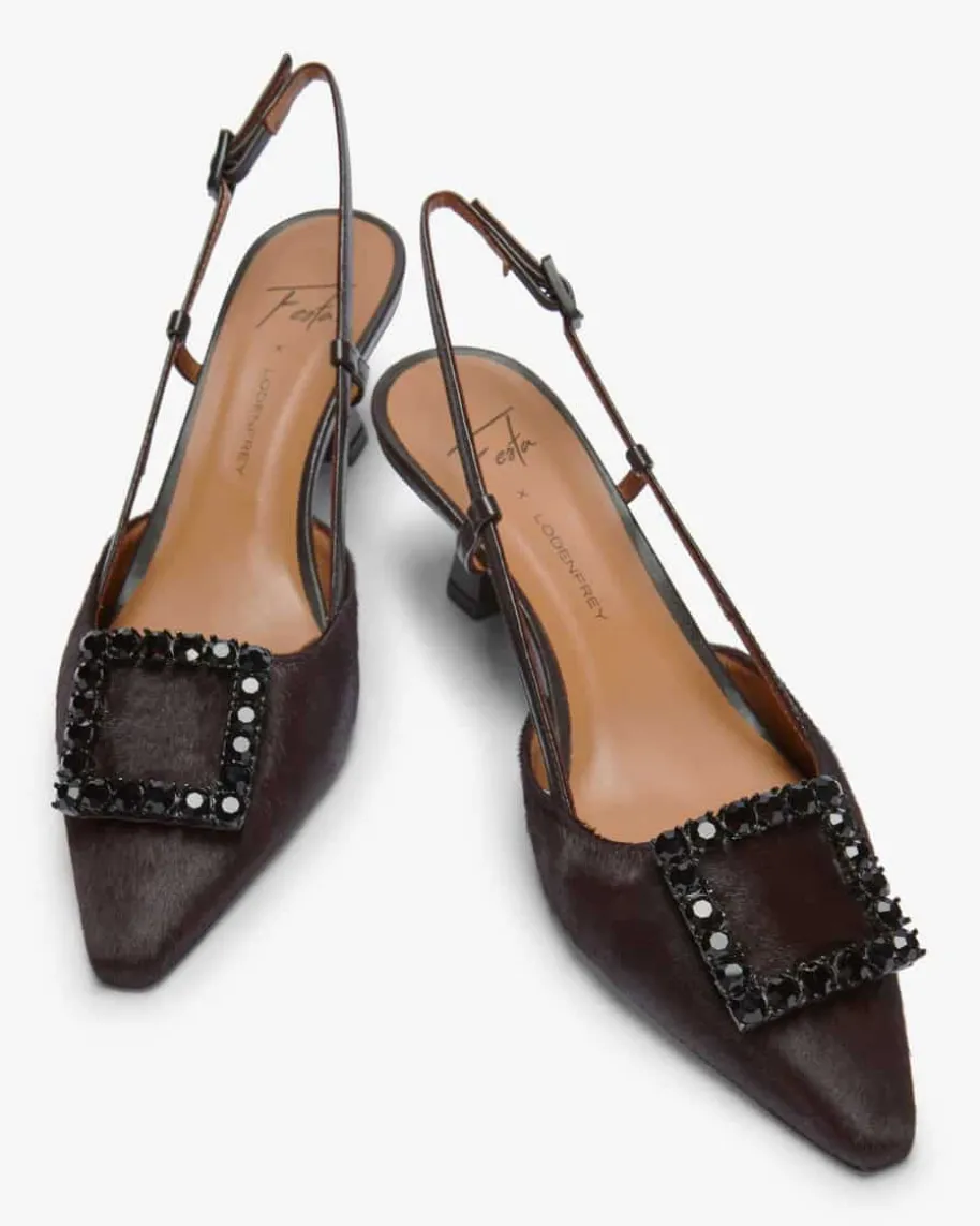 Stefi Slingback-Pumps für Damen von Festa in Dunkelbraun. Dieses Modell bestichtdankder angesagten Ponyfell-Aufmachung und der eleganten Slingback-Riemen, währenddiemarkante viereckige Brosche mit Schmuckstein-Besatz den Schuh zu einem absolutenBlickfang macht.
