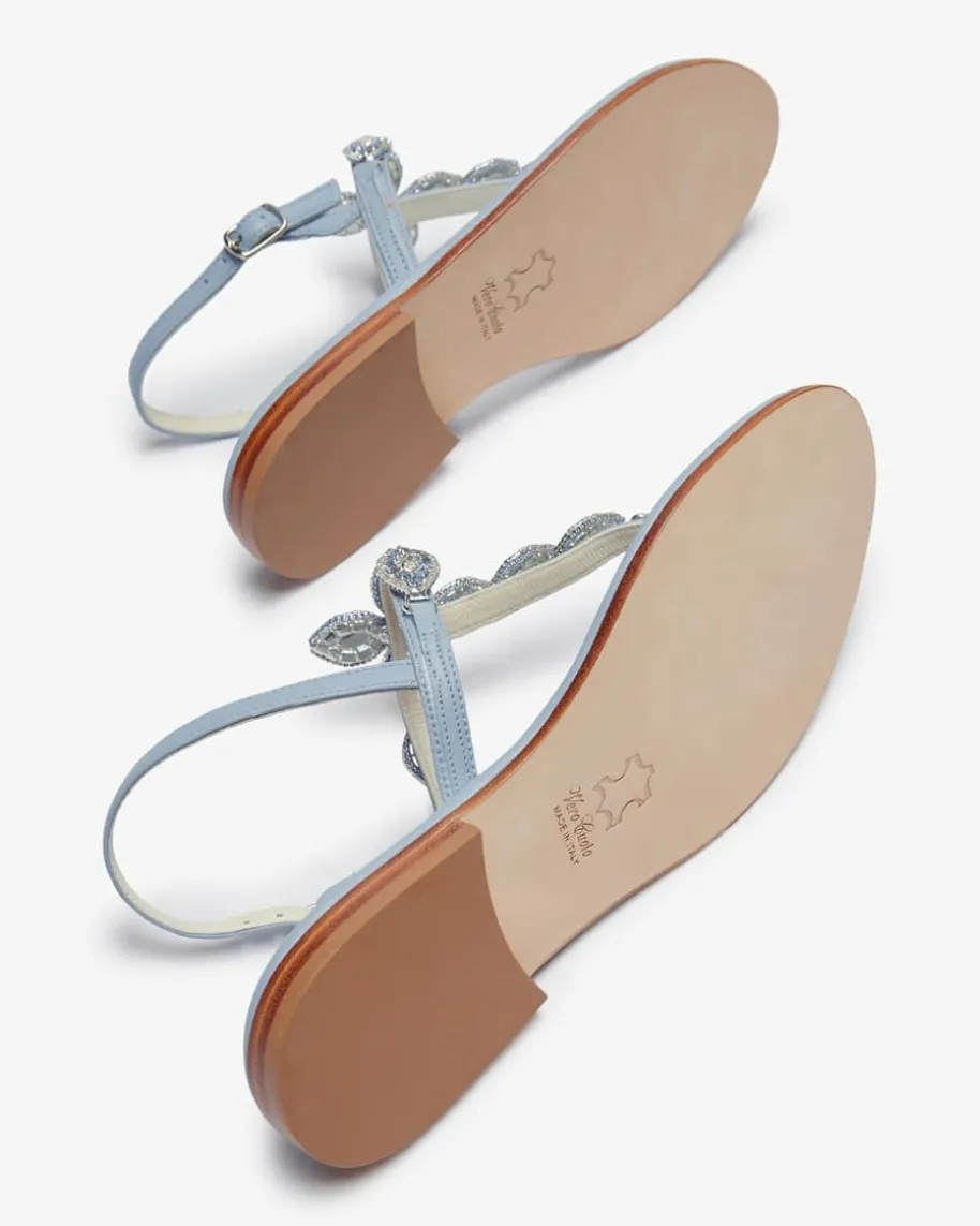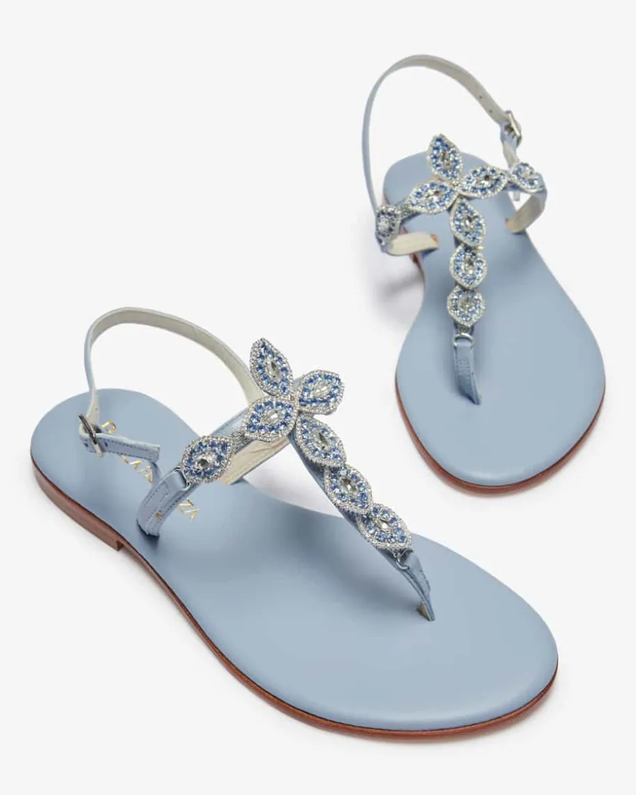 Zehentrenner-Sandalen für Damen von Paola Fiorenza in Azur. Das Modell inhochwertiger Leder-Aufmachung avanciert zu ihrem neuen Sommerliebling, der sichdank des auffälligen Schmuckstein-Besatz in Ornamenten-Dessin sowohl elegant alsauch casual stylen lässt und jedes Outfit zu einem optischen Highlight macht.