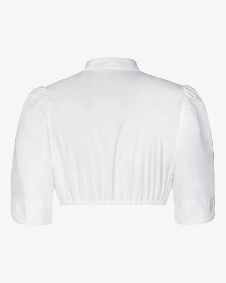 Zoe Dirndlbluse für Damen von Tostmann in Weiß. Die hochgeschlossene Blusebesticht durch den dezenten Stehkragen und die zarten Häkel-Borten an denSäumen.