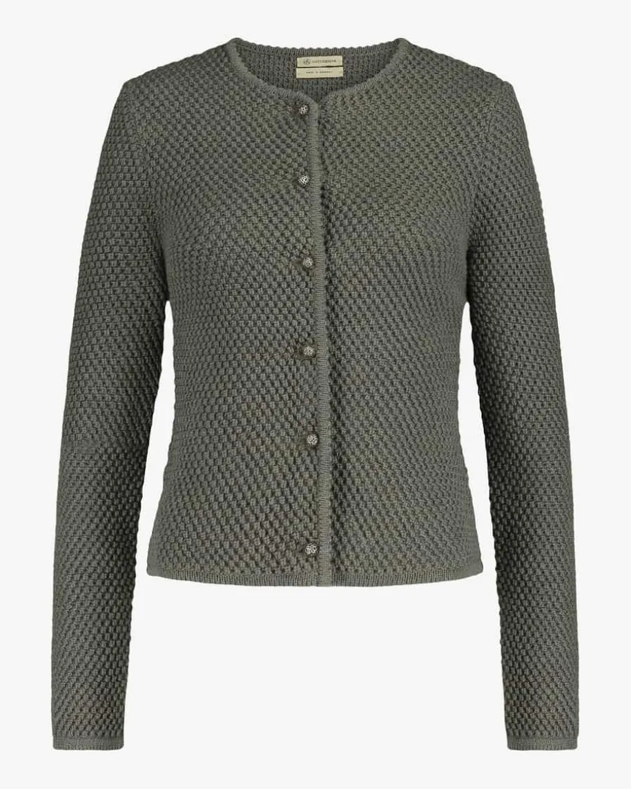 Agnes Trachten-Strickjacke für Damen von Gottseidank in Oliv. Die extrafeineMerino-Wolle punktet mit besonders angenehmem Tragekomfort, während dasraffinierte Strickmuster sowohl haptisch als auch optisch ein modischesHighlight setzt.