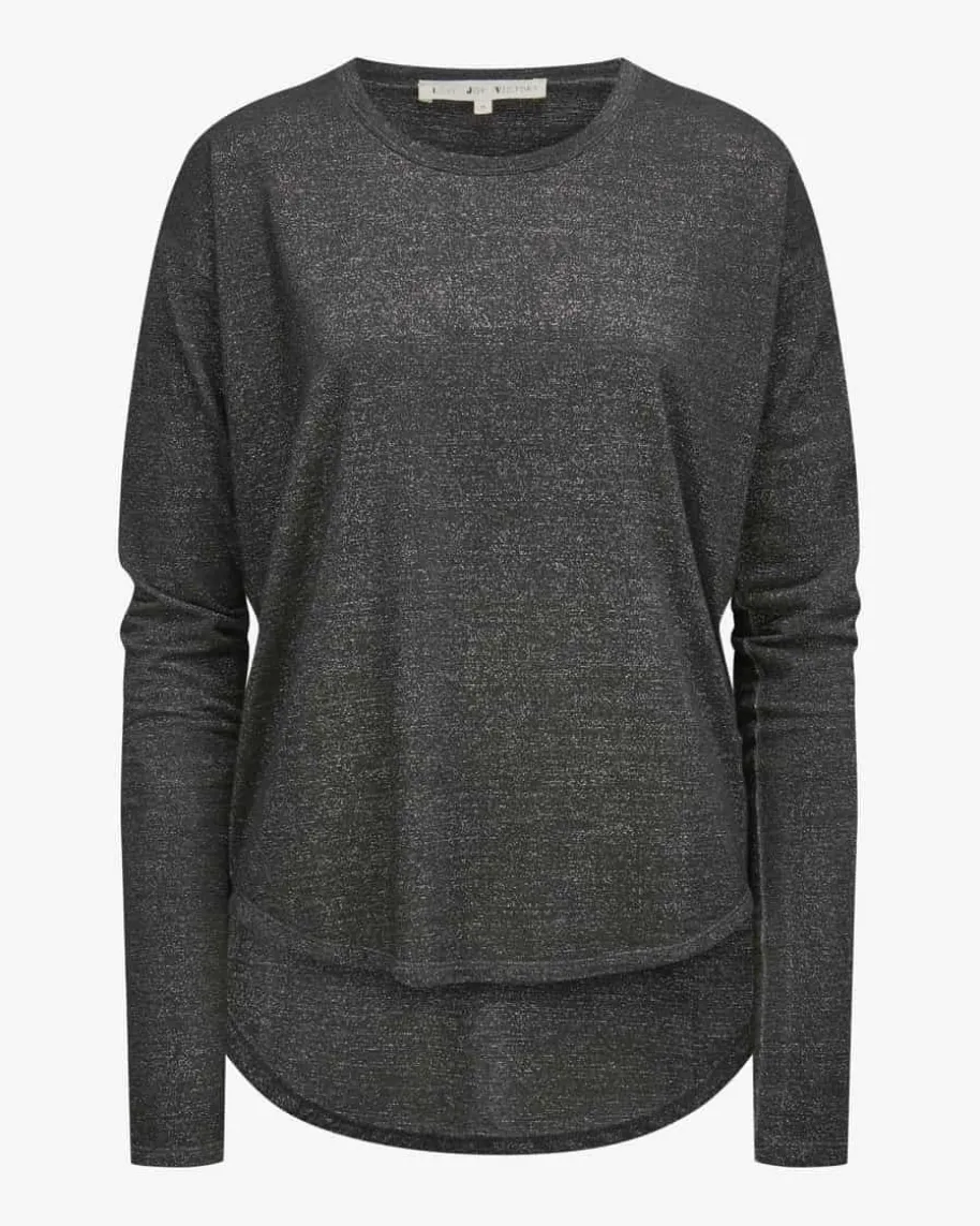 Alania Longsleeve für Damen von Love Joy Victory in Schwarz und Silber. Einperfektes Basic ergänzt mit glitzernder Optik für komfortable Lounge-Looks – DasModell überzeugt dank dem elastischen Material-Mix und der besonders angenehmenSoft-Touch-Qualität mit wahrlichen Wohlfühlmomenten.