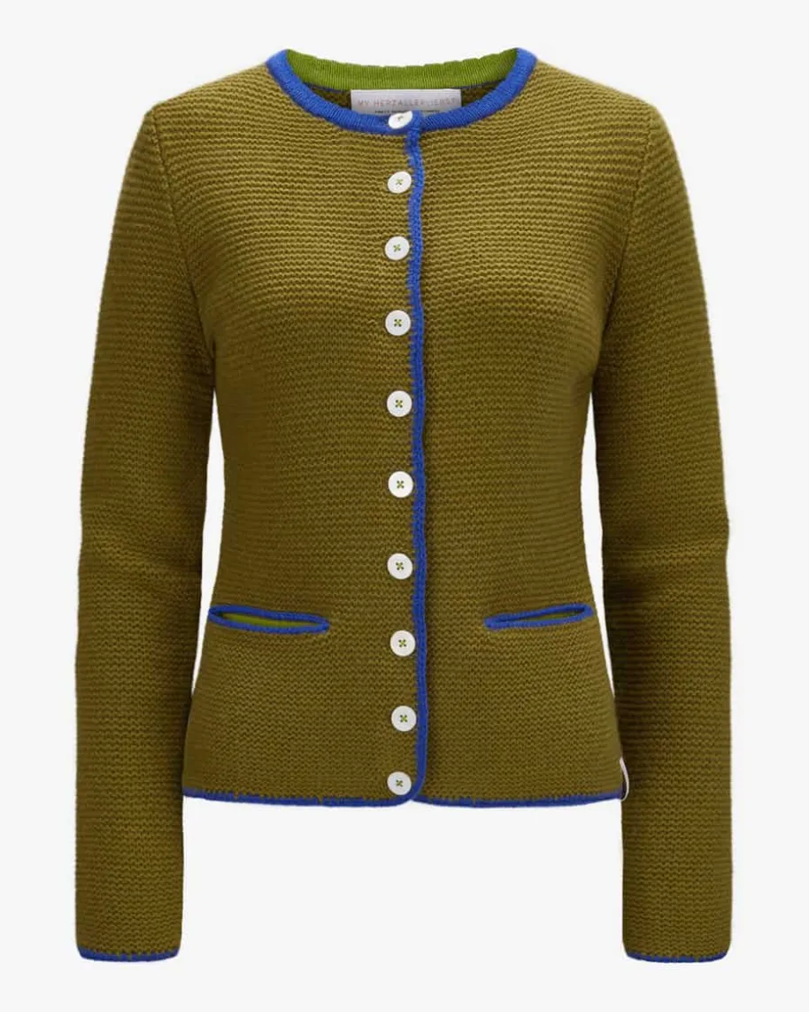 Alice Trachten-Cashmere-Strickjacke für Damen von My Herzallerliebst in Khakiund Blau. Das Modell präsentiert sich dank der Kontraststreifen in modischerAufmachung, während die hochwertige Cashmere-Qualität besonders angenehmeTragemomente verspricht.