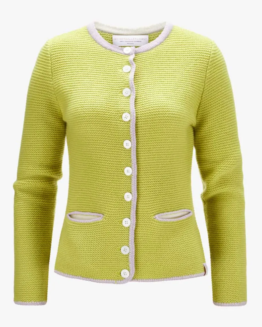 Alice Trachten-Cashmere-Strickjacke für Damen von My Herzallerliebst in Lemon,Flieder und Creme. My Herzallerliebst – das 2010 gegründete Label steht fürabsoluteHingabe und Leidenschaft. Zugleich interpretiert es dank verschiedenerFarbkombinationen Trachtenmode neu, anders, frischer und spezieller. Das legergeschnittene Modell aus hochwertiger Cashmere-Qualität punktet mit besondersweichem Griff, während das feine Strick-Muster, modische Kontrastpaspeln sowieKnöpfe in Perlmutt-Optik den traditionellen Trachten-Look harmonisch abrunden.