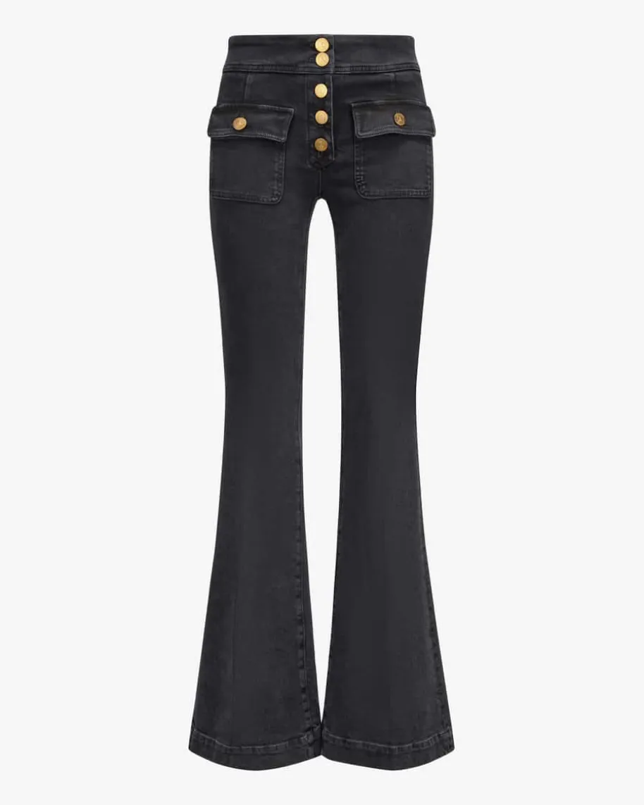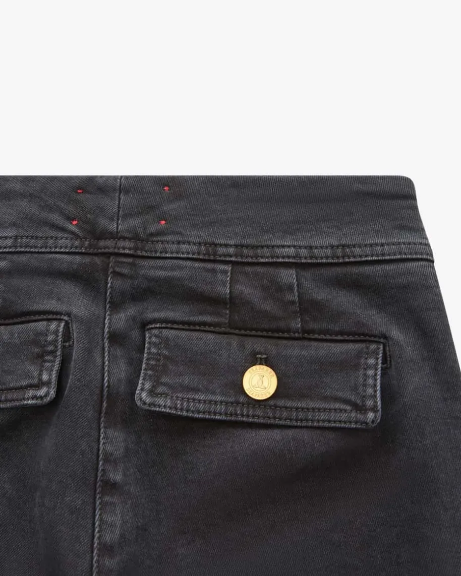Anais Jeans für Damen von Seafarer in Schwarz. Das ausgestellte Modell überzeugtdank der elastischen Baumwoll-Denim-Qualität mit angenehmen Tragemomenten,während die markanten Front-Taschen zusammen mit den goldfarbenen Logo-Knöpfendas Gesamtbild modisch abrunden.
