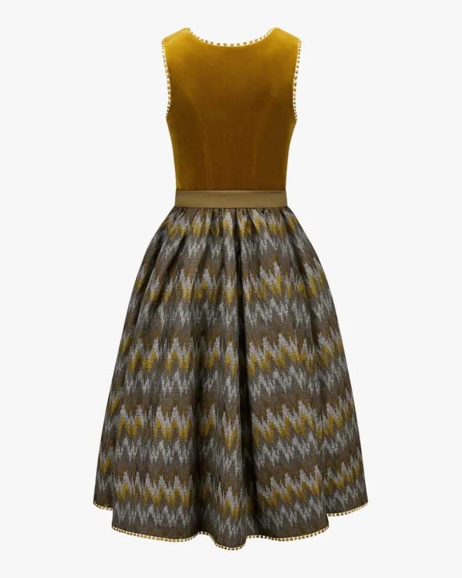 Ancona Dirndl lang mit Schürze für Damen von Kinga Mathe inOcker und Braun. MitLiebe zum Detail entwirft das deutsche Label aufwendigeTrachten-Kreationen mitdem gewissen Etwas und überzeugt mit erlesener Stoffauswahlsowie kreativeDesigns. Das Modell überzeugt mit klassischem Mieder aushochwertigem Baumwoll-Samt, während der Unterrock eine feminine Passform verleiht.Die changierendeSchürze aus Satin komplettiert das abstrakte Allover-Dessindes Dirndlsharmonisch.