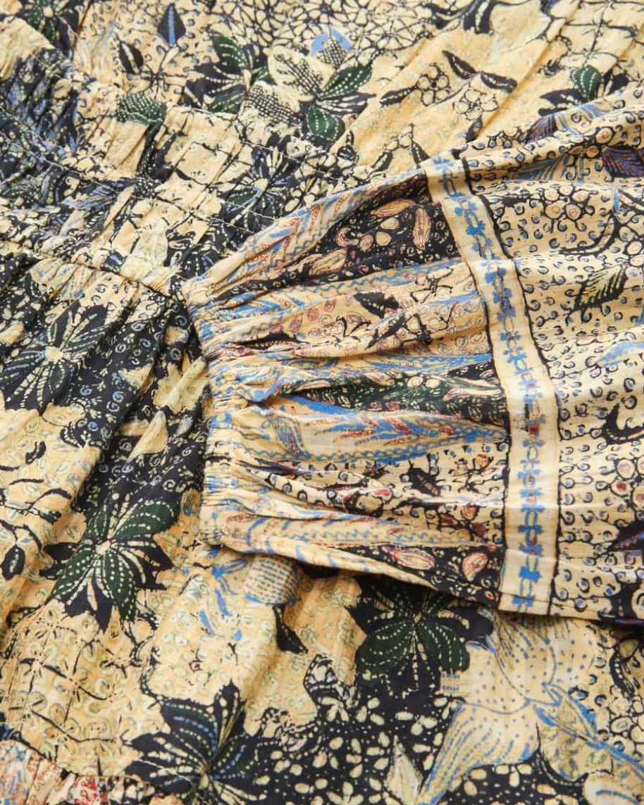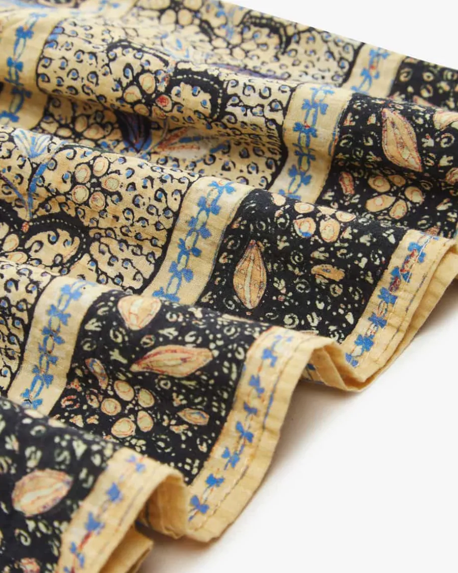 Anika Kleid für Damen von Ulla Johnson in Dunkelgrün, Hellgelb und Blau. DasBoho-Modell punktet mit leichter Material-Qualität, die für angenehmeTragemomente sorgt, während das farbenfrohe Ethno-Dessin modische Akzente setzt.Die geraffte Taille und verspielte Schleifen-Details an den Schultern runden densommerlichen Style harmonisch ab.