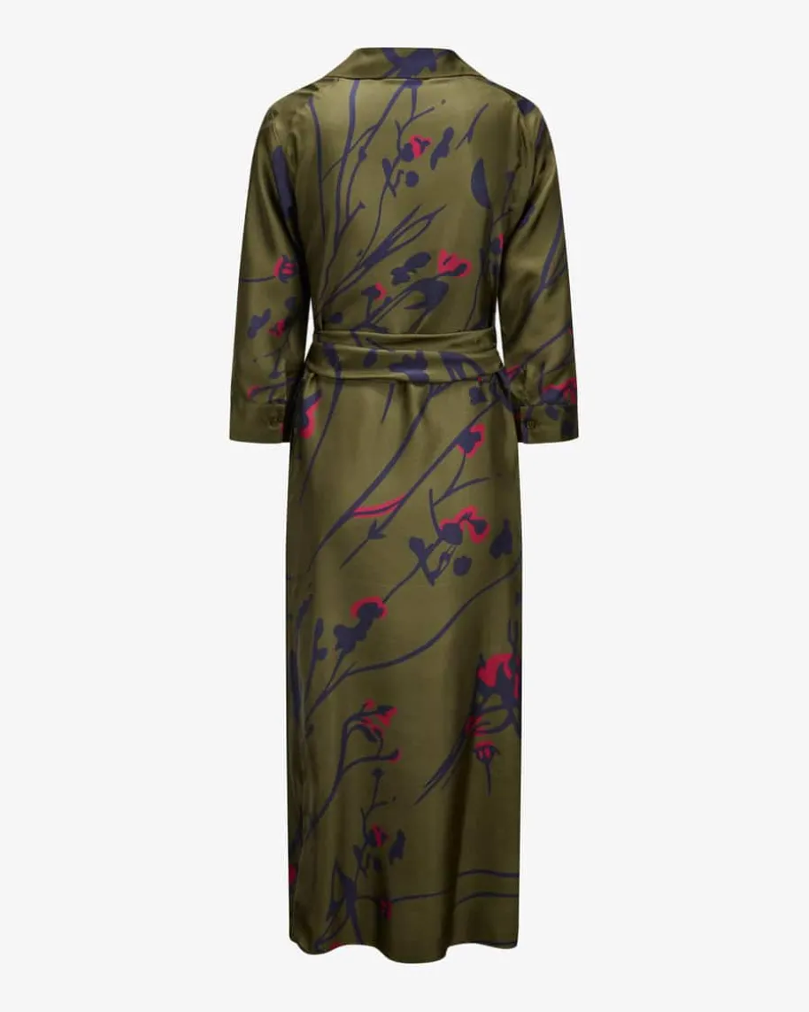 Anna Seiden-Wickelkleid für Damen von Lu Li Lina in Oliv, Blaugrau und Pink. DasModell präsentiert sich mit klassischen Hemdblusen-Details und raffinierterWickel-Funktion, während die fließende Seiden-Qualität mit floralem Allover-Muster sowohl optische als auch haptische Highlights verspricht – Ein Hingucker-Look für vielseitige Styles.