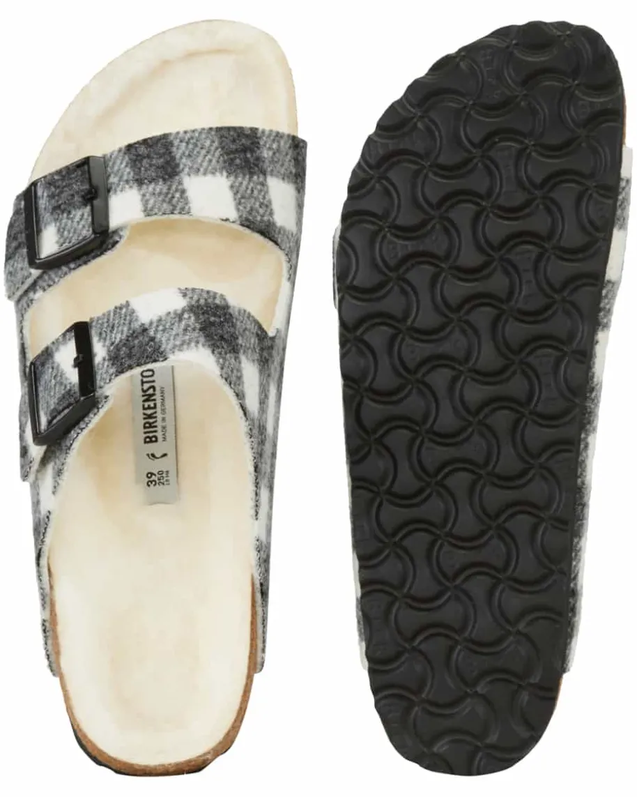 Arizona Sandalen für Damen von Birkenstock in Schwarz und Weiß. Seit über 200Jahren revolutioniert Birkenstock die Schuhindustrie immer neu. Mit seinemeinzigartigen, anatomischen Fußbett hat Birkenstock ein innovativesProduktkonzept auf den Markt gebracht, das bis heute Bestand hat. Das Lammfellsowie das Karo-Dessin sorgen für einen zusätzlichen Eyecatcher des Modells.