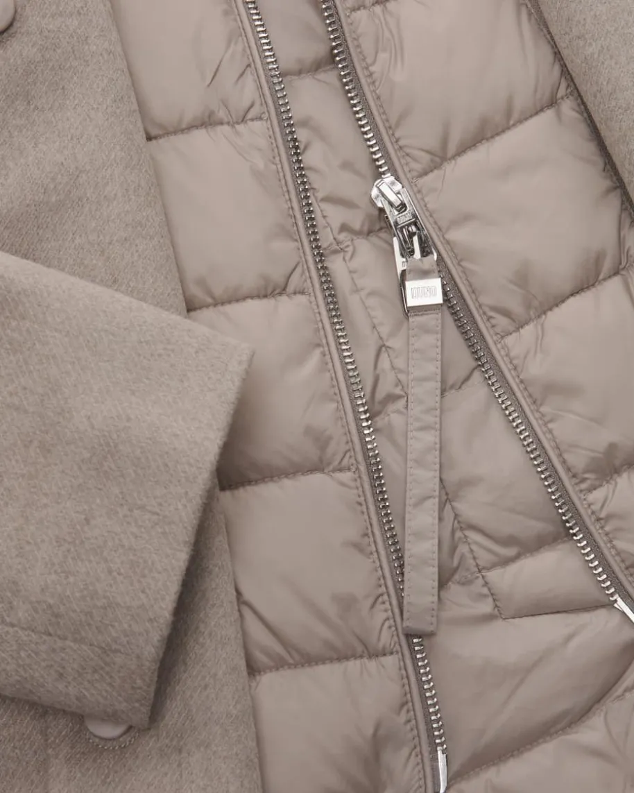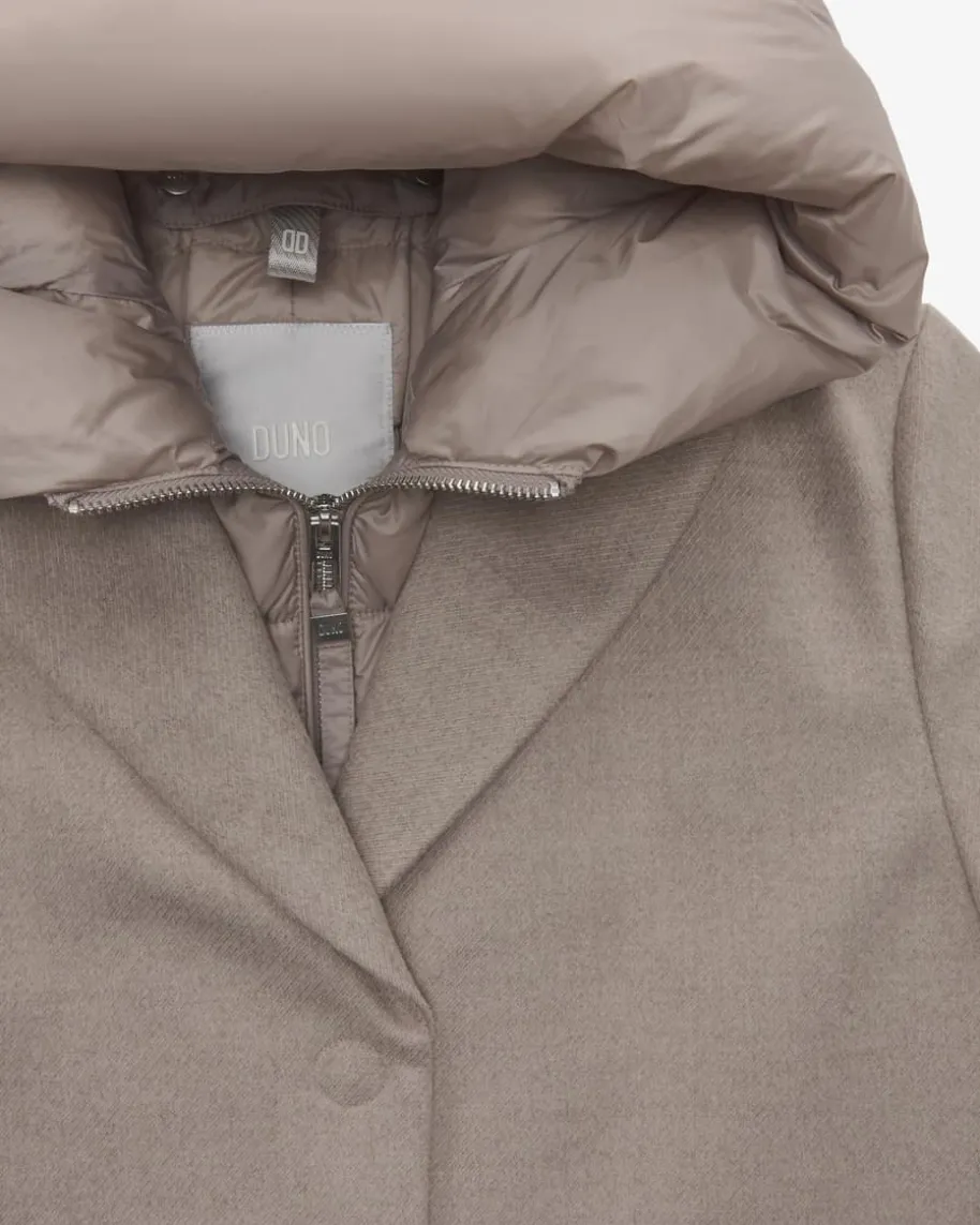 Artemide Daunen-Wollmantel für Damen von Duno in Sand. Made in Italy – Die Markekombiniert funktionale Outerwear mit italienischer Schneiderkunst und einemzeitgemäßen, urbanen Stil. Auch dieses Hybrid-Modell überzeugt dank der leichtenDaunen-Feder-Füllung sowie der heraustrennbaren Steppblende als wärmenderBegleiter mit stilvollem Touch, den Sie je nach Wetterbedingung und Anlass edeloder sportiv stylen können.