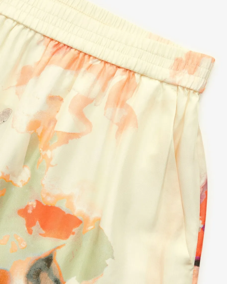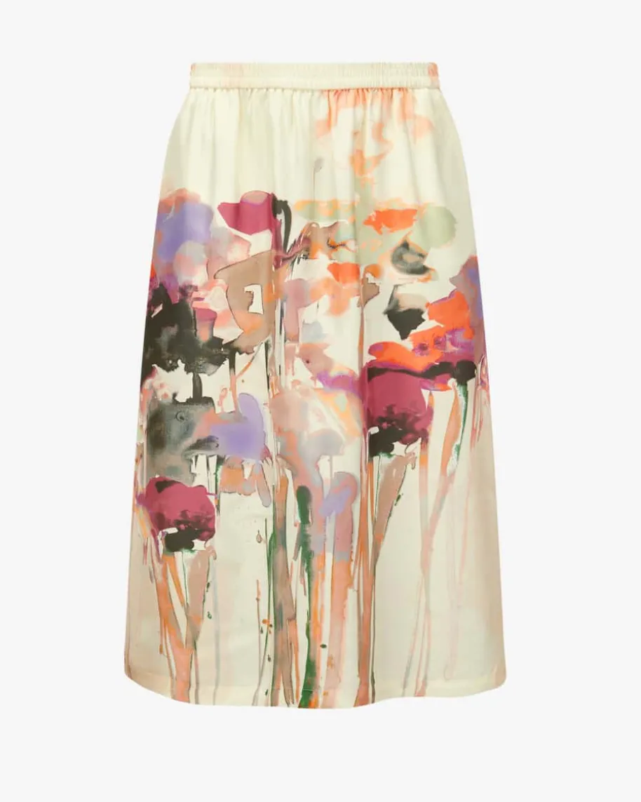 Aruma Seidenrock für Damen von Munthe in Creme und Bunt. Das ausgestellte Modellzeichnet sich besonders durch die fließende Seiden-Qualität aus, die eineelegante Optik und angenehme Haptik kreiert. Zugleich verleiht der farbenfroheund abstrakte Print im Aquarell-Stil das gewisse Etwas.