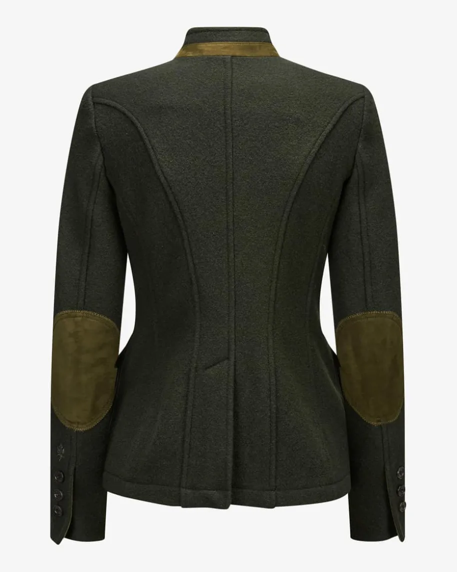 Aschach Trachtenblazer für Damen von Habsburg in Moosgrün und Oliv. Dastaillierte Modell besticht dank der hochwertigen Schurwoll-Qualität mitangenehmem Griff, während klassische Details sowie kontrastierende Veloursleder-Einsätze das traditionelle Gesamtbild perfekt ergänzen.