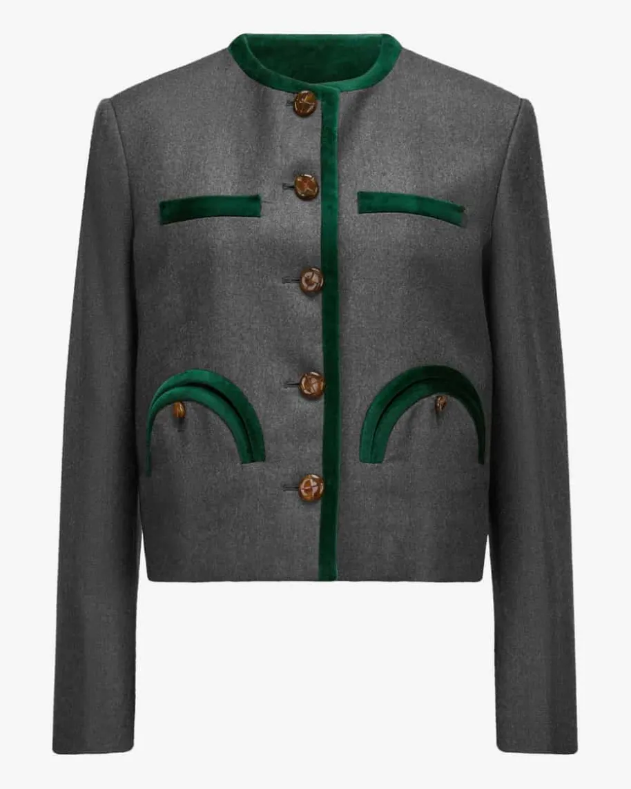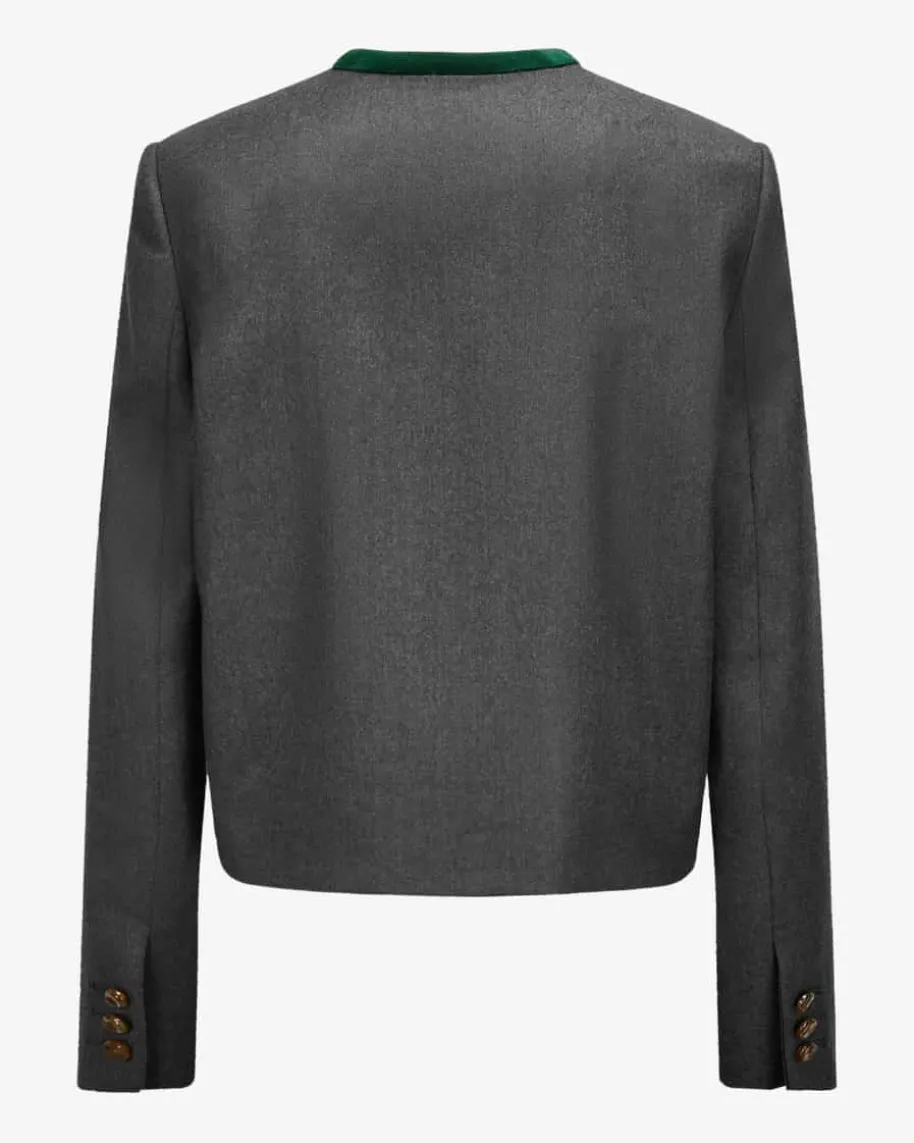 Astoria Shamo Bolero Trachten-Blazer für Damen von Blazé Milano in Grau undDunkelgrün. Mit klassischen Details präsentiert sich das Trachten-Modell alstraditioneller Begleiter, der sich vielseitig kombinieren lässt. Zugleich rundendie labeltypisch abgerundeten Taschen und der weiche Samt-Besatz den Gesamtlookmit angenehmen Tragemomenten ab.