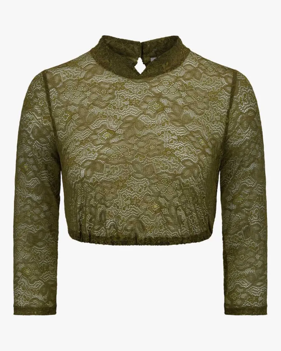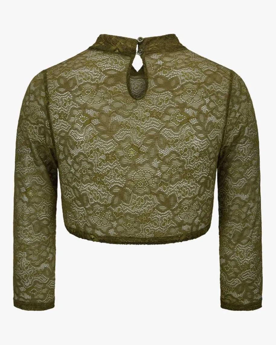 Barbara Dirndlbluse für Damen von LODENFREY München 1842 in Oliv. Dassemitransparente Modell begeistert dank des floralen Spitzen-Designs sowie demdezenten Stehkragen, während der elastische Saum perfekten Tragekomfortverspricht.
