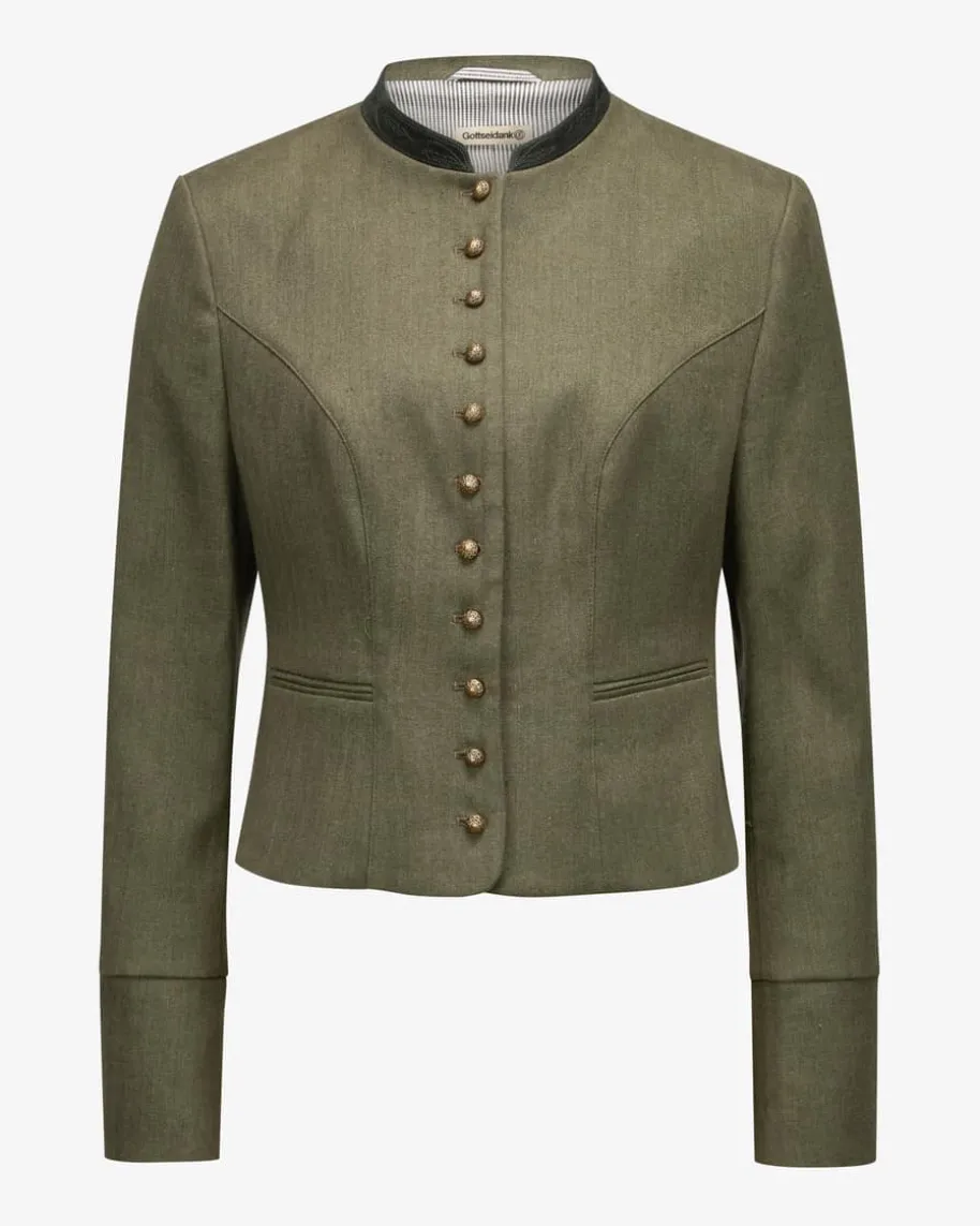 Barbara Trachtenblazer für Damen von Gottseidank in Graugrün. Der hochwertigeLeinen-Mix punktet mit besonders angenehmem Tragekomfort, während filigrane,goldfarbene Knöpfe sowie ein dezentes Schößchen das traditionelle Modell gekonntvollenden.