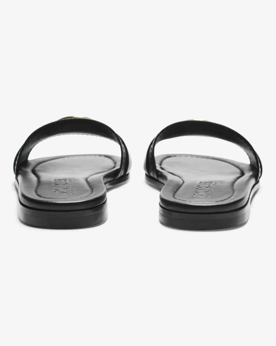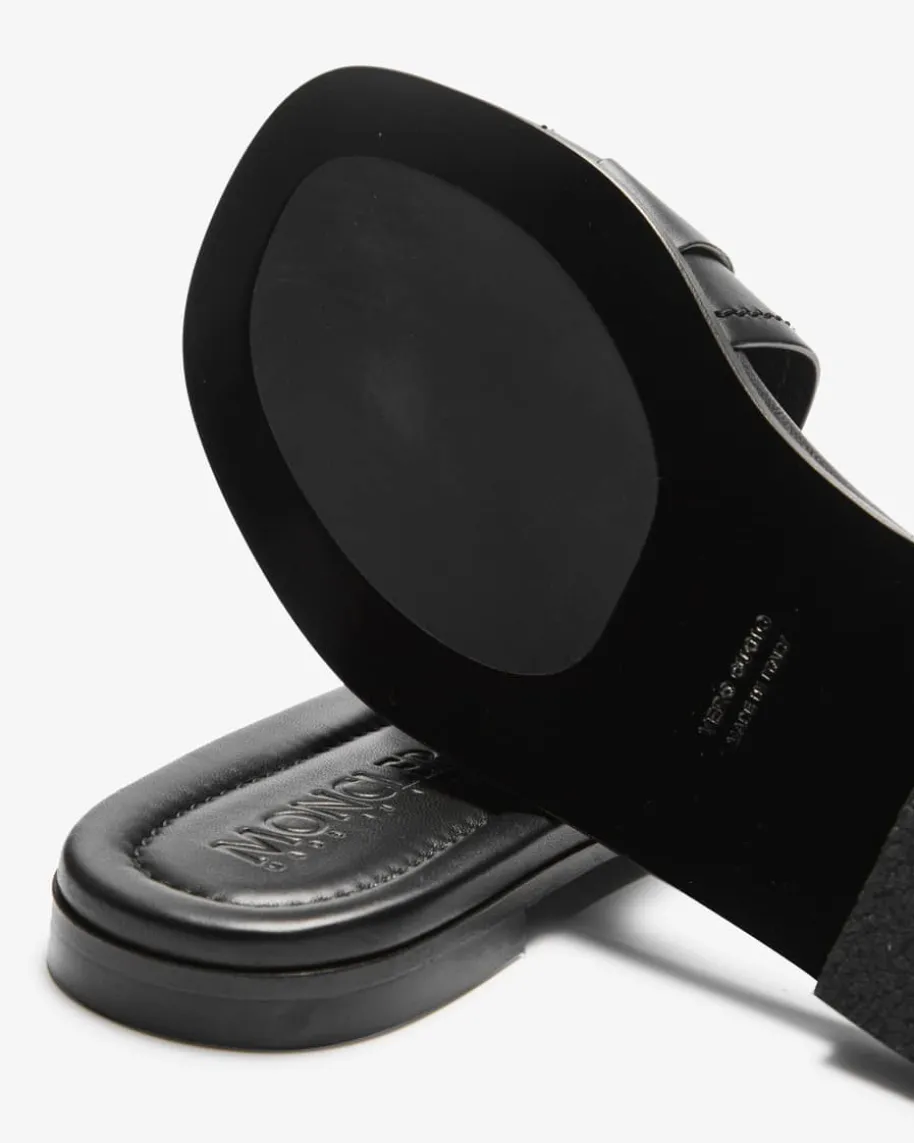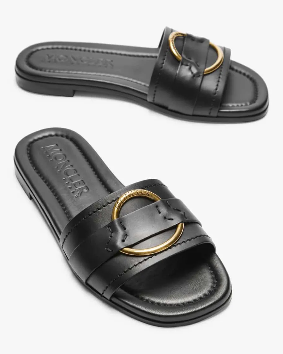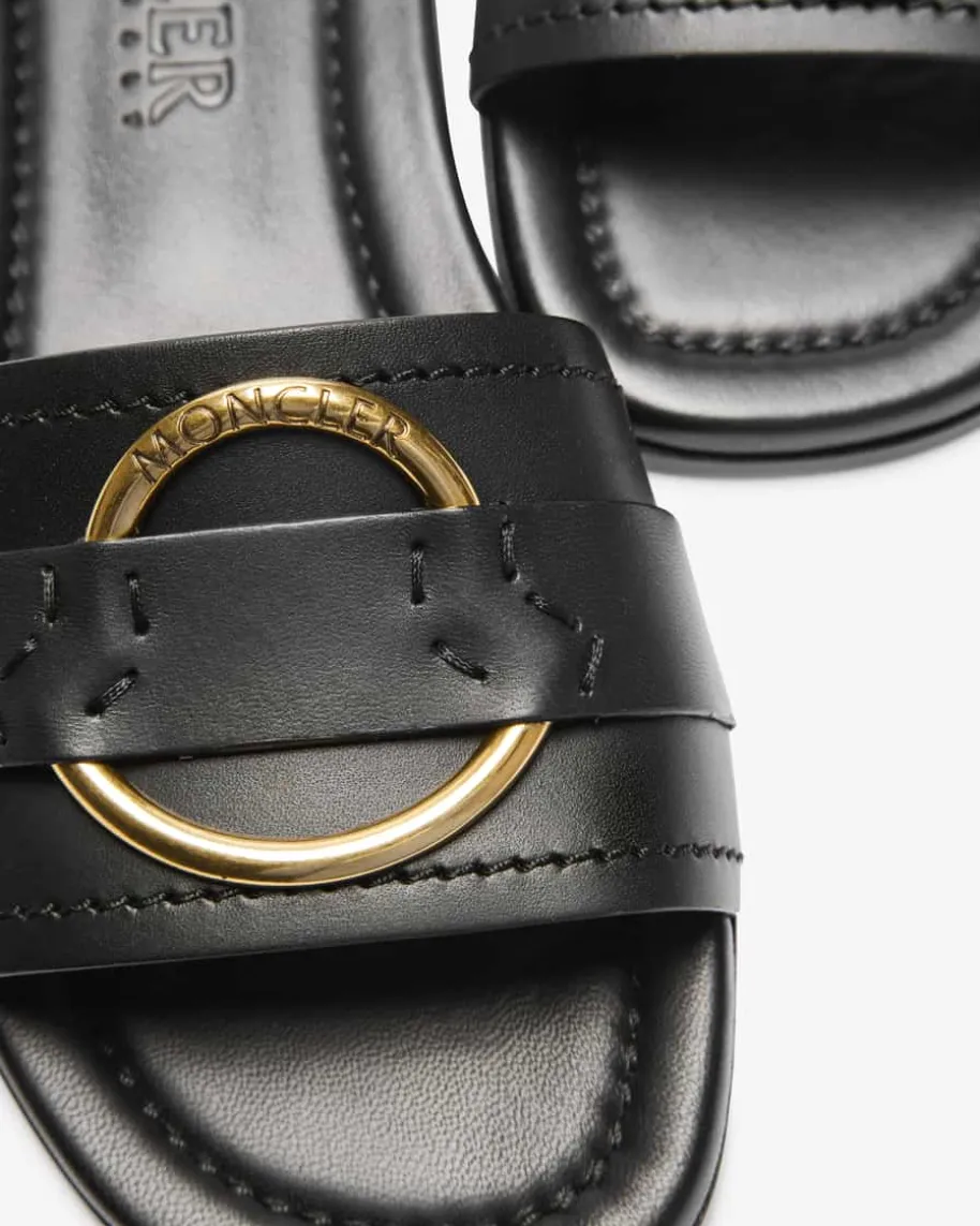 Bell Slide Pantoletten für Damen von Moncler in Schwarz. Das Modell aushochwertigem Leder wird durch den goldenen Ring mit Logo-Detail elegant in Szenegesetzt und avanciert so zum sommerlichen Begleiter für stilvolle Looks.